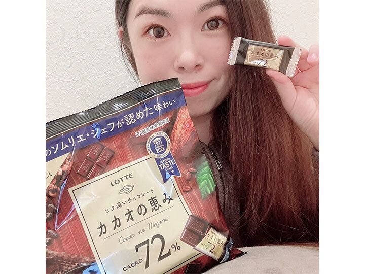「高カカオチョコというと、苦くて食べにくいイメージがありましたが、ロッテの『カカオの恵み』は苦みが少なく、カカオのコクとほんのりとした甘さがクセになりそう!」と喜ぶのは、サンキュ!アンバサダーの土屋まゆさん(@sumimayu)。