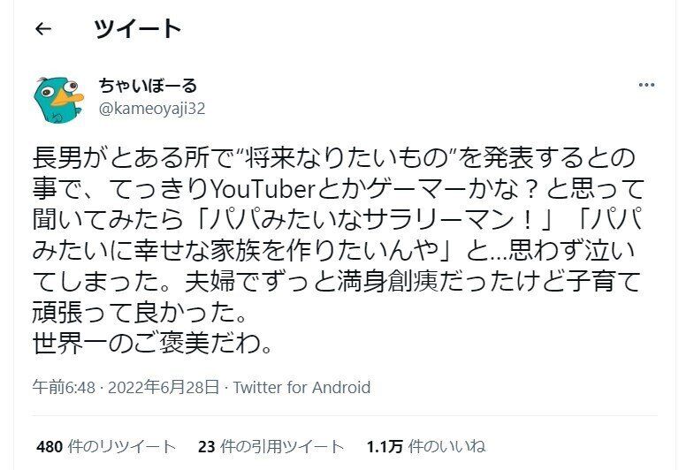 息子さんの夢は、YouTuberかなにかだろうと思った、ちゃいぼーるさんでしたが、予想に反した答えが返ってきて、感涙。
