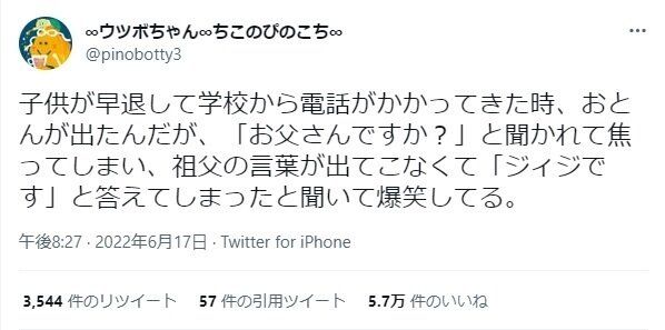 学校の先生との電話というかしこまった場面での「ジィジです」に癒やされる人が続出した今回の投稿。ウツボちゃんちこのぴのこちさんのツイートには、ほかにもたくさんの気づきやおもしろエピソードが満載です!