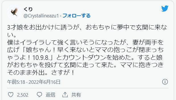 それにイライラしそうになるくりさんですが、ママはとても上手に娘さんをお出かけに連れ出します。