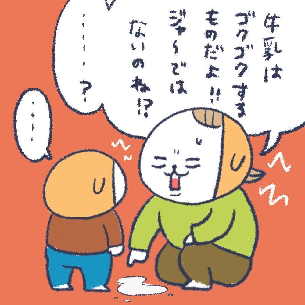 コップに入った牛乳を床にこぼす息子・こうどんくんの行動に、おうどんさんは青ざめます。