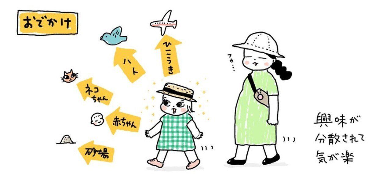 おでかけにでかけると、娘ちゃんの矢印がいろいろなものに分散され、ママもフゥ……と一息。おでかけが「楽」に思えるタイミングがあるというのを育児して初めて知った、というエピソードでした。