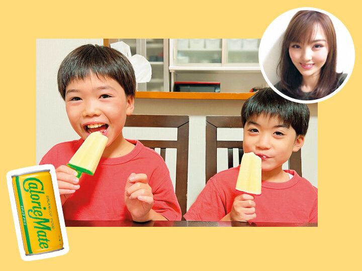 「おやつも大事な栄養補給のタイミング。カロリーメイトのリキッドタイプを凍らせた"凍らせメイト"は、アイス代わりにサッパリ食べられるから、息子たちも大好きなんですよ」 サンキュ!アンバサダー海老原葉月さん(千葉県 35歳)大翔くん(10歳)愛翔くん(7歳)