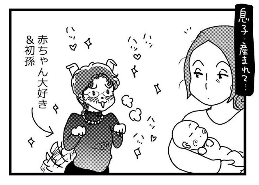 無事に生まれた息子くんを前に、「マテ!」された犬のように待っているお姑さん!