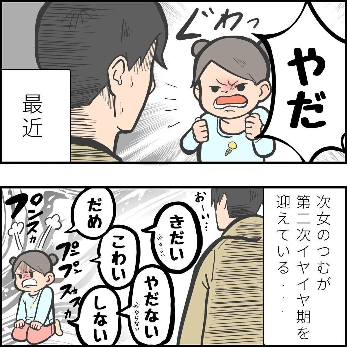 つむちゃんのイヤイヤへ、もう少し優しく対応しようかな、と思うゆーぱぱさんでしたが、早くも挫けそうになるのでした。