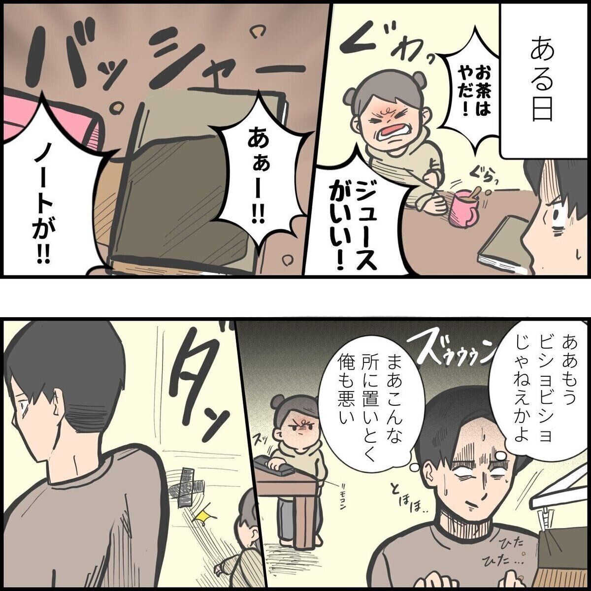 お茶をこぼしてしまったつむちゃんは気持ちをコントロールできず、今度はリモコンを投げてしまいます。あまりに激しい主張に、ゆーぱぱさんも……。
