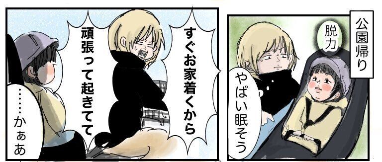 公園の帰り道、なんとお子さんが寝落ち寸前!ほとんど力が入っていません。急いで帰宅するため、おしそさんは自転車を漕ぎ出そうとしますが……。