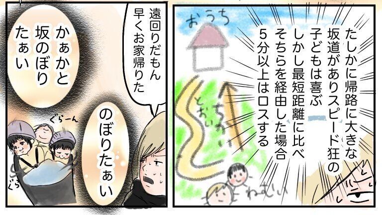 坂道を選ぶと5分以上のタイムロスが生じます。お子さんが眠る前に、一刻も早く帰りたいおしそさん。しかし……