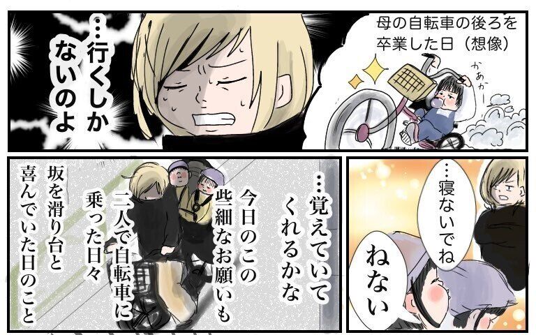 お子さんが自転車の後ろを卒業する日を思い浮かべ、「行くしかない」と心に決めるのです!二人で自転車に乗った日々を覚えていてほしいという、切ない親心が描かれます。そして、結末は……