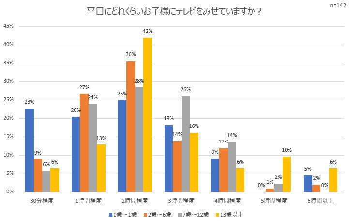 子どもが平日にどれくらいテレビを見ているか聞いたところ、1歳以下では30分・1時間・2時間でバラつきの出る結果に。2歳以上になると、2時間程度視聴している人が多いようです。
