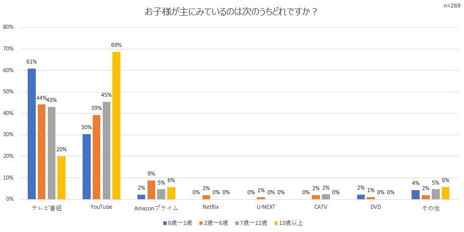 子どもが主に見ているものについては、年齢別で回答結果が分かれました。0~1歳は「テレビ番組」との回答が61%でしたが、13歳以上では「YouTube」が69%と圧倒的。