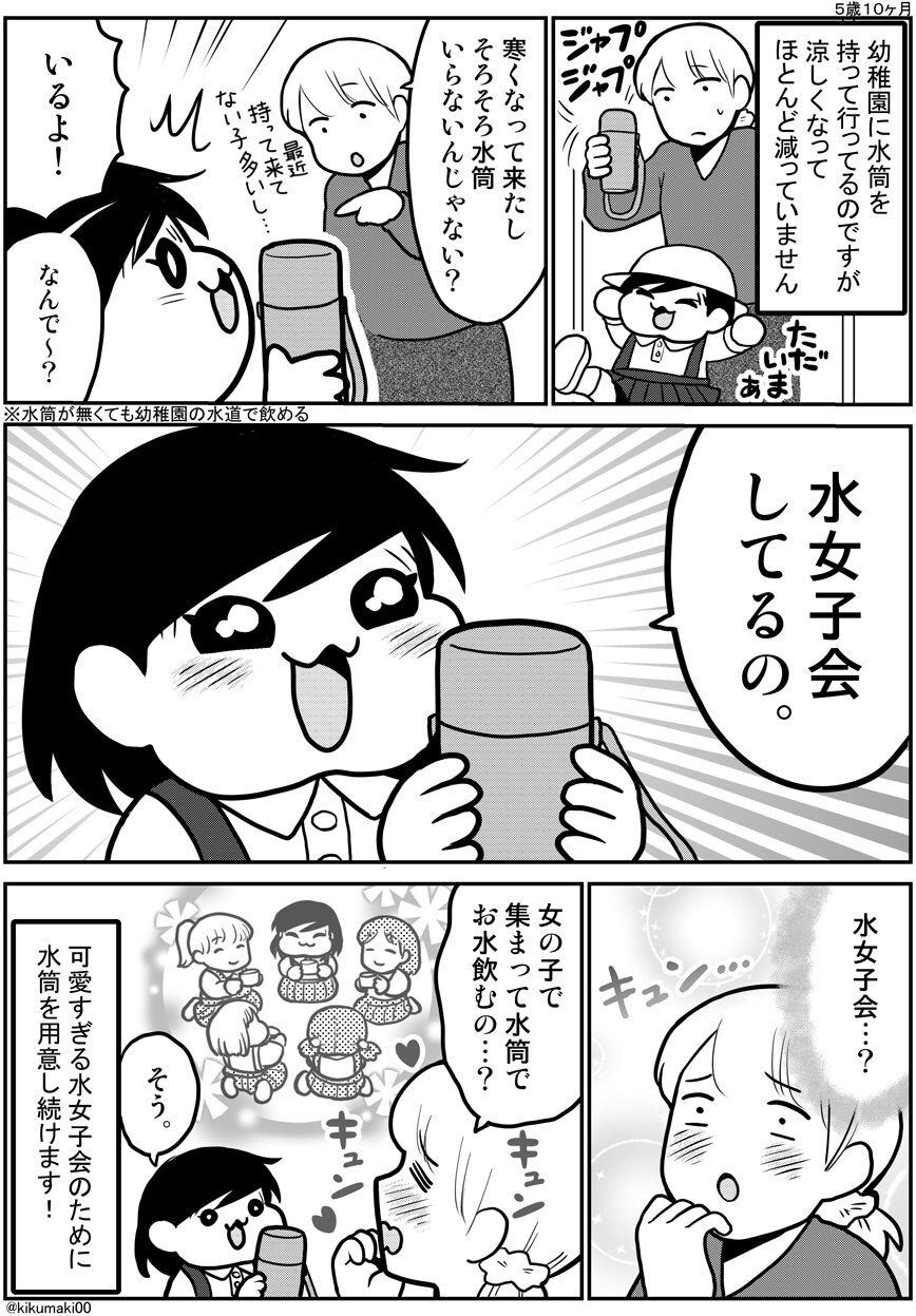 娘さんに水筒を持って行く理由を聞いたところ、「水女子会」という思いもよらない回答に驚いた、きくまきさん。幼稚園での水女子会の様子を想像したらかわいかったので、漫画にしようと思ったそうです。