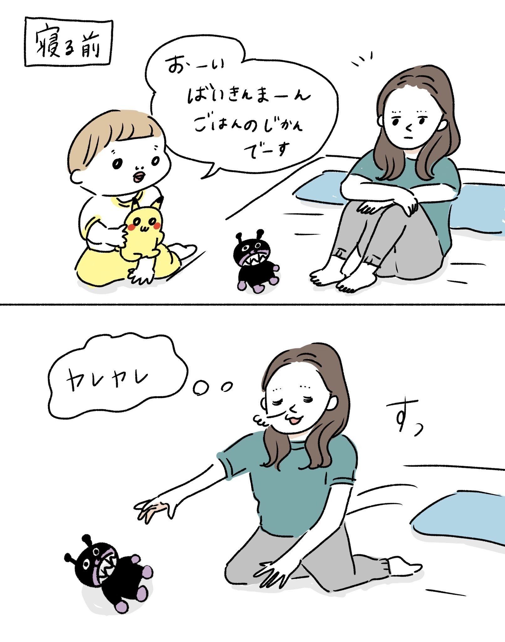 寝る前のひととき、息子さんとごっこ遊びをするママ。「やれやれ」と思いながらも、かわいい息子さんのために一生懸命です。しかし、本当に「やれやれ」と思っていたのは……最後に放った息子さんのひとことは破壊力満点!