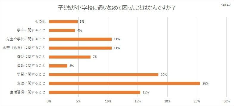 子どもが小学校に通い始めて困ったことの中で、一番多かった回答が「友だちに関すること」(26%)でした。保育園や幼稚園とは違い、親や先生を介さない子ども同士のつきあいが増えるためトラブルとなることもあるようです。また、初めての授業についていけずに「学習に関すること」(19%)で問題を感じる人もいるようでした。