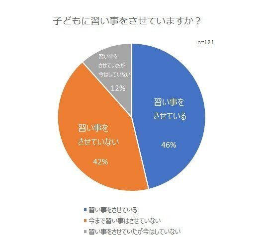 子どものいる家庭を対象としたアンケートで「習い事をさせている」と答えた人は46%でした。約半数近くの家庭で、子どもに習い事をさせていることになります。