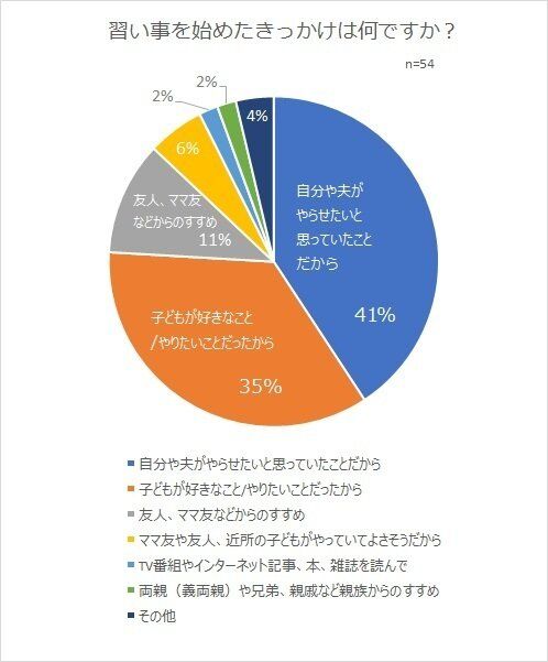 母親か父親がやらせたいと思っていたケースに、友人や親族、メディアなどからの影響がきっかけとなって習い事を始めるケースを合わせると62%に。子どもが自発的にやりたがったケースは35%にとどまりました。