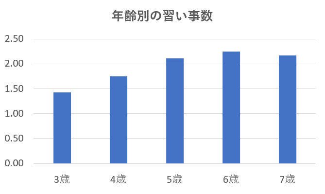多くの子どもが習い事に通っていますが、どんな習い事に何か所通っているのでしょうか?習い事をしている子どもの平均的な習い事の数は1.795個。3歳~7歳までの子どもの習い事数をみると、年齢が上がるにつれて習い事が増える傾向にあります。