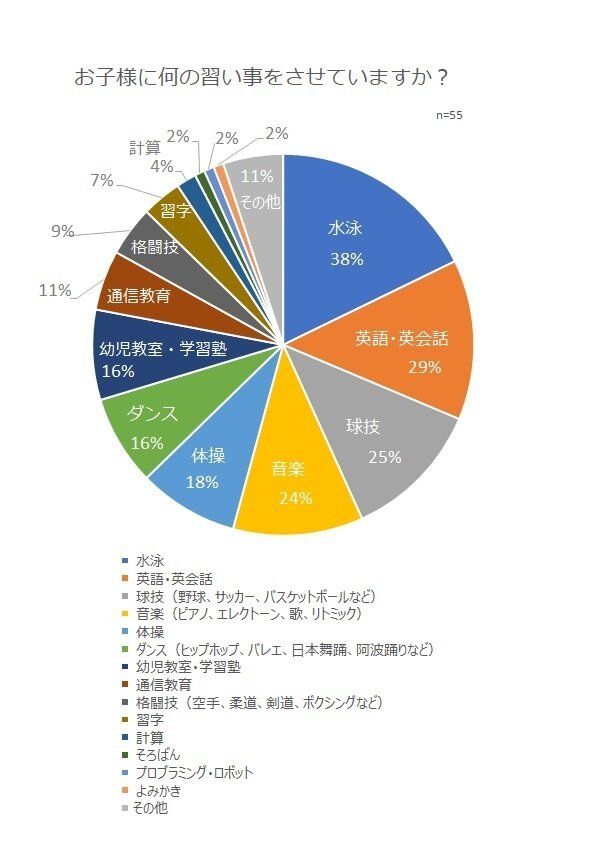子どもの習い事人気1位は水泳で38%、次に英語・英会話が29%、3位が球技で25%でした。