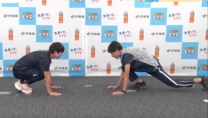 座った状態から、骨盤を使って前に進みます。競歩のトップアスリートである池田選手は骨盤を使うのが上手! 腹筋がかなり鍛えられるとともに、腕を連動させると、歩いたり走ったりするときと同じ動きになります。
