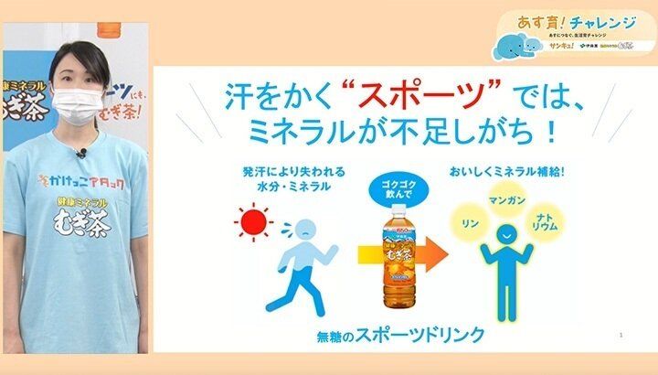 汗をかいたら、健康ミネラルむぎ茶をゴクゴク飲んで、水分&ミネラル補給をしましょう!