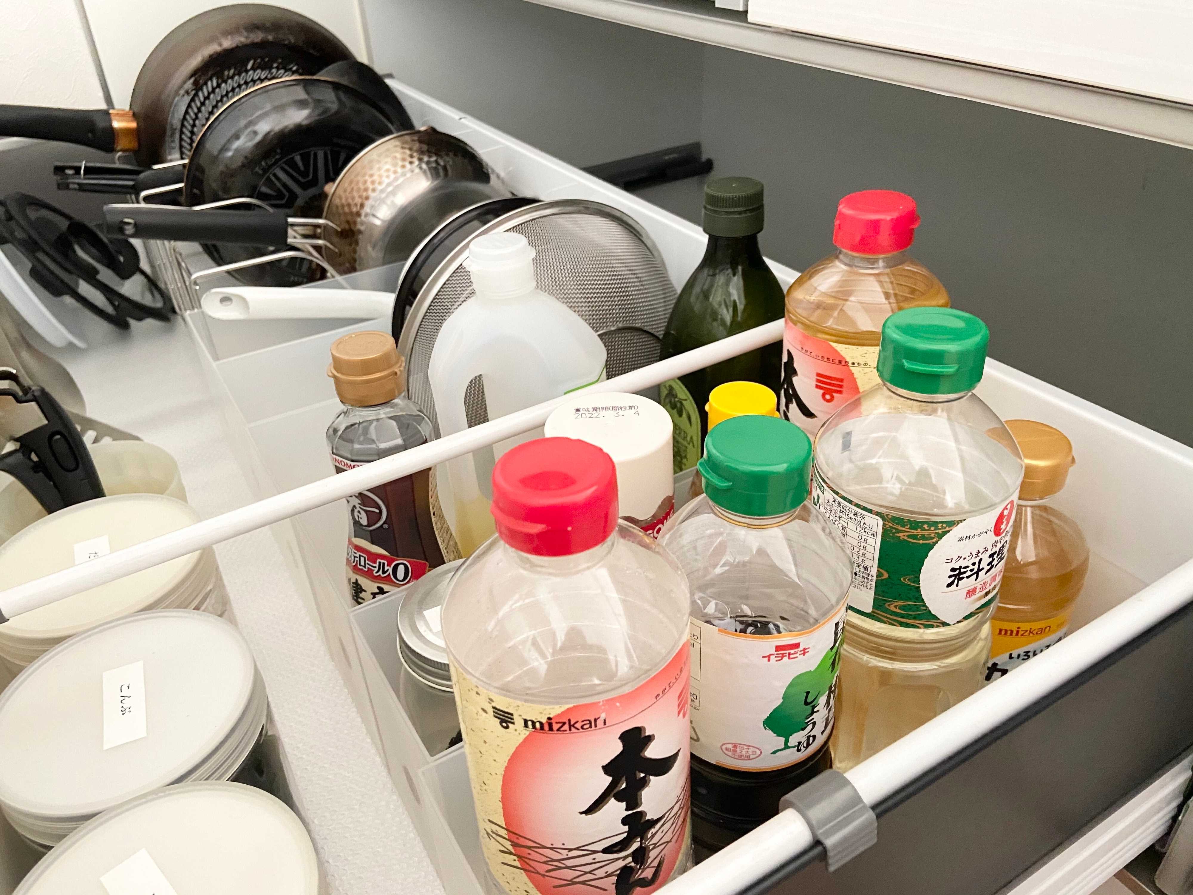 液体調味料は詰め替えをしようとすると液だれしたり、ボトル容量とピッタリのものでないと二重管理となり手間に!台拭きはすぐに汚れていき、衛生管理が手間だったりします。そこで液体調味料はそのままのボトルで、布巾はやめて洗って使えるペーパータオルに切り替えたら、管理がとっても楽になりました。