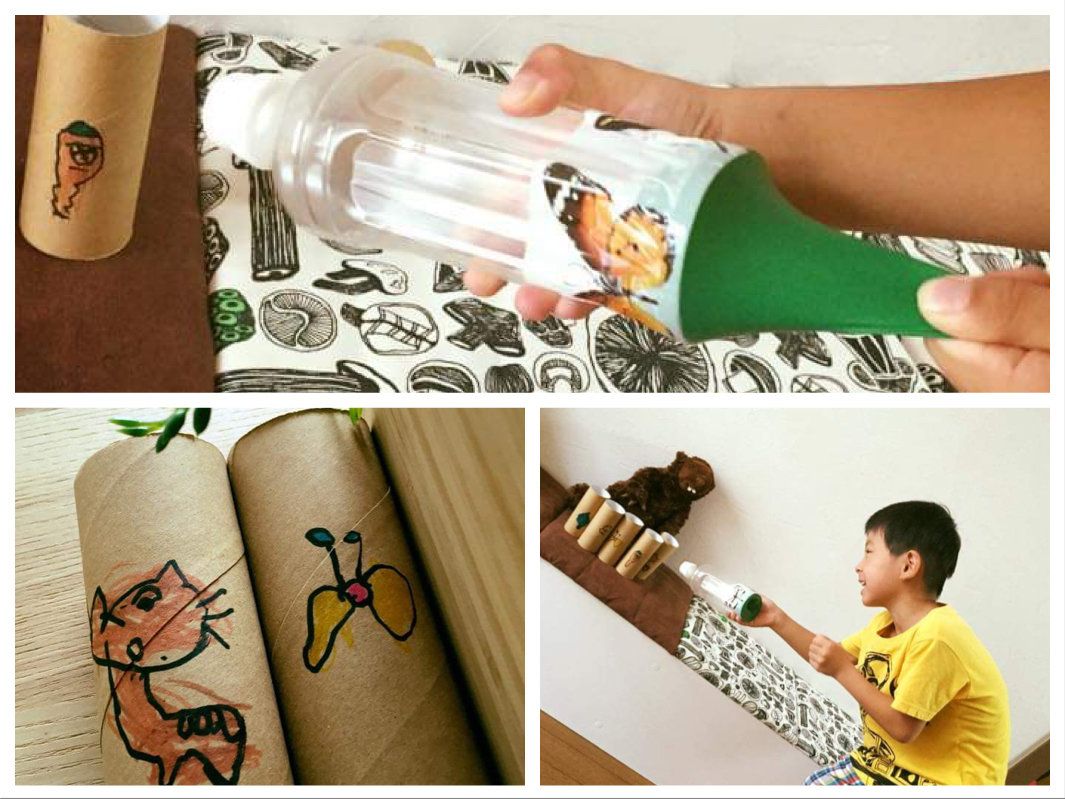 お家遊び、色々やりだすと止まらない。材料もわざわざ買わなくても家にあるガラクタとハサミやテープがあれば、無限大カモ。
