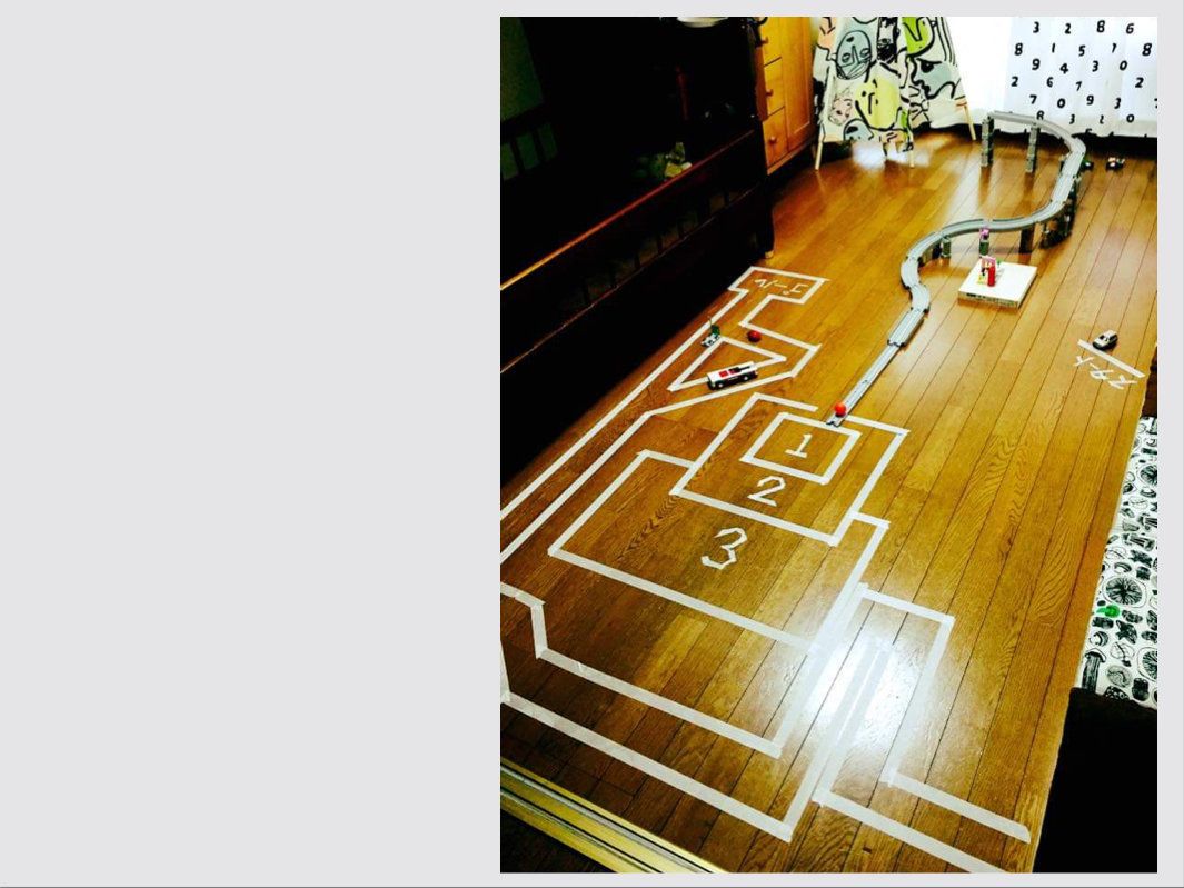 2.その上にミニカーを走らせる。ミニカーが止まった場所でポイントがつく、というルールを作っても面白いですよ。