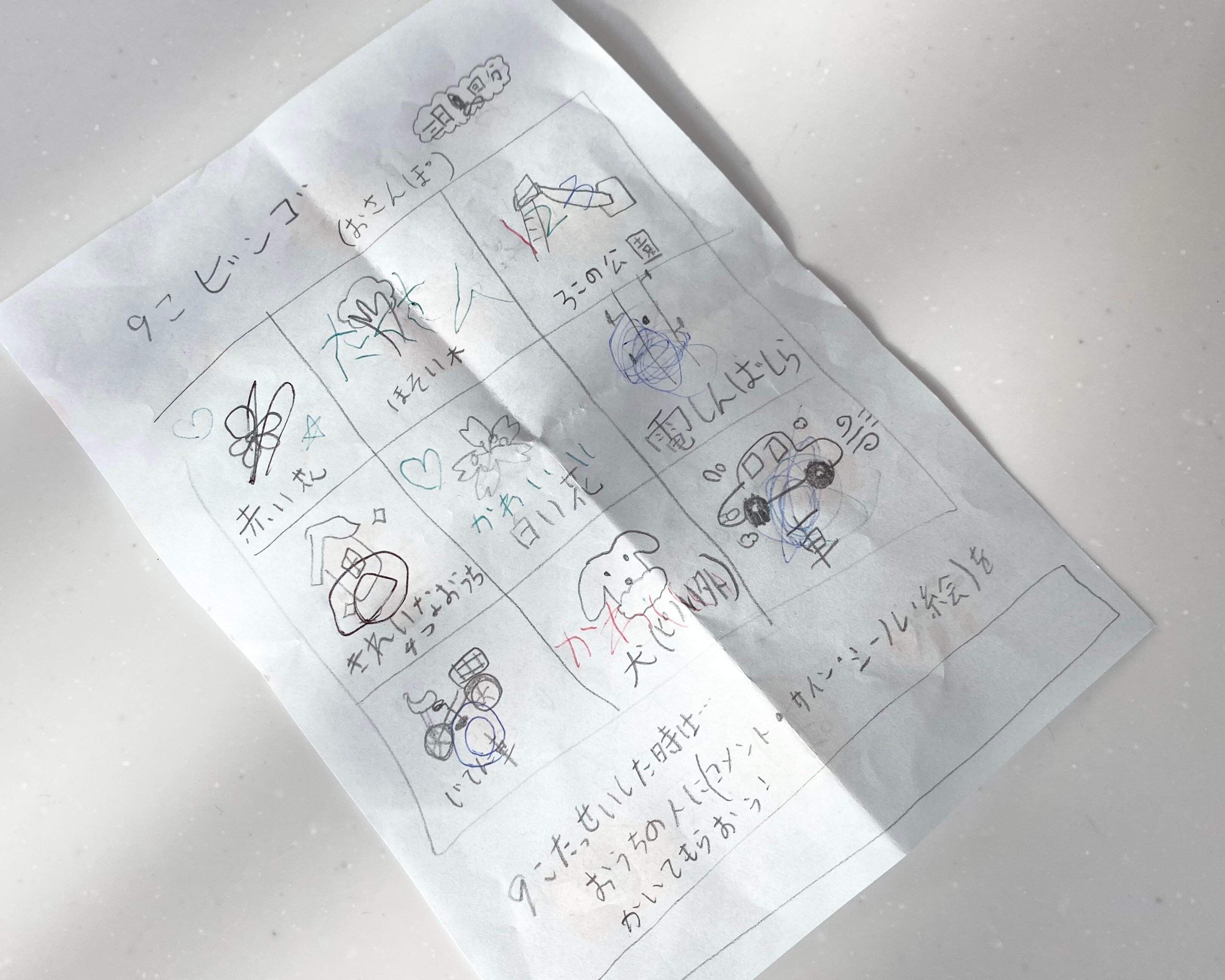 お散歩中に見つけたらマークし、ビンゴが何列できるかな?というもの。