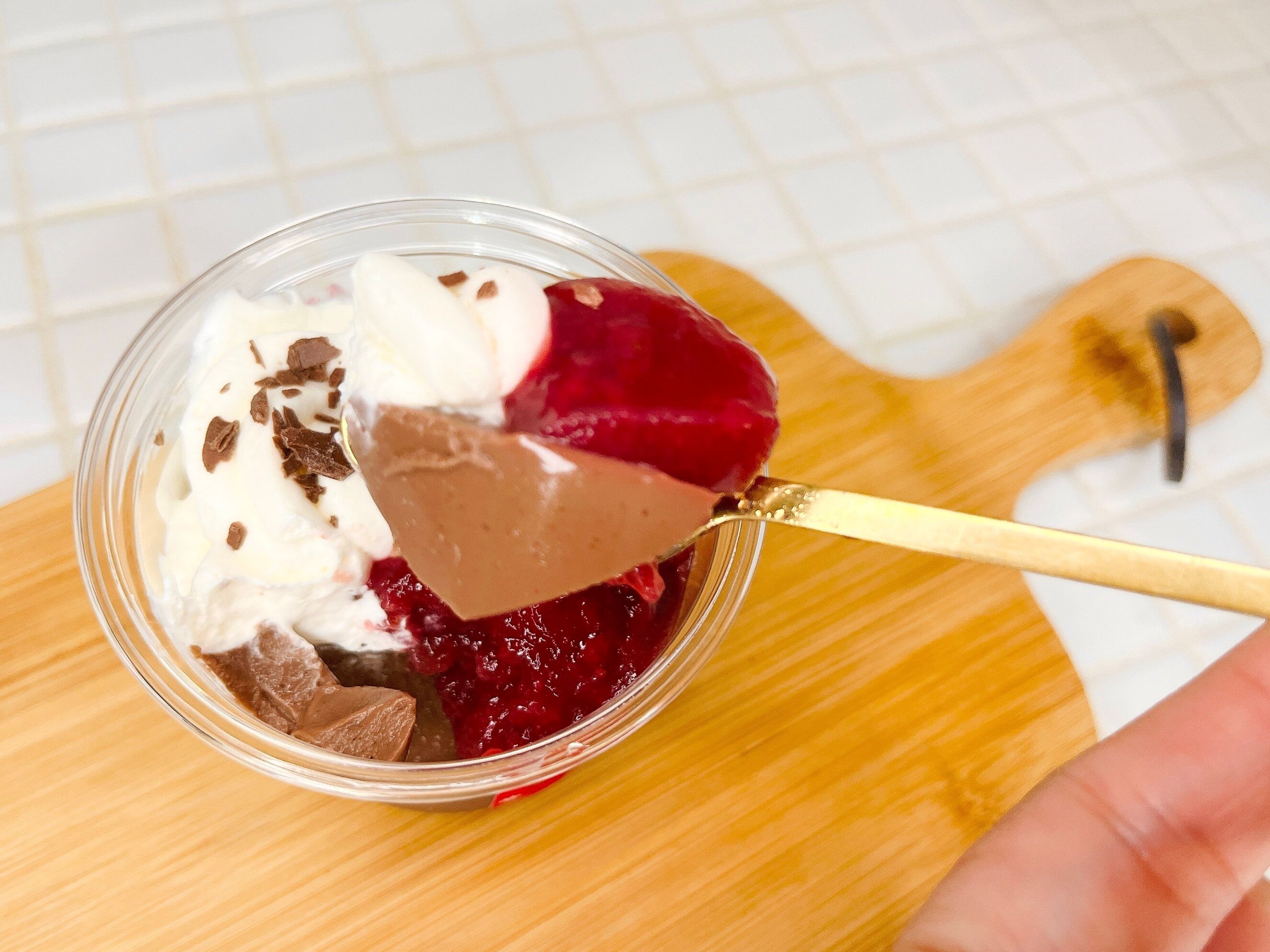 苺ソースは酸味がありますが、ホイップの甘さとショコラプリンが合わさって絶妙な美味しさを演出してくれます。ホイップの上のチョコレートもアクセントになって美味しさ倍増です。