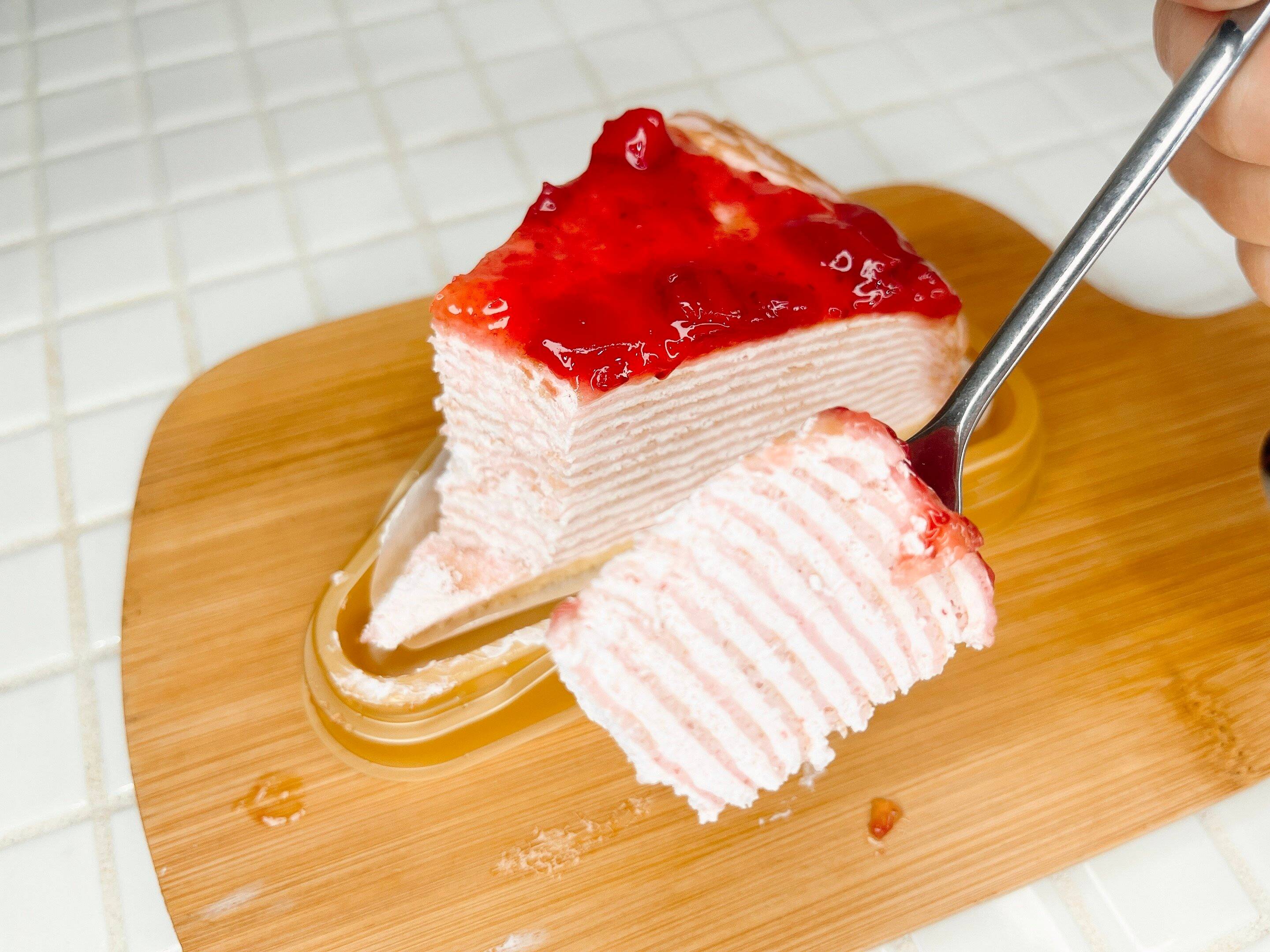 何層にも重ねられたクレープと苺クリームは柔らかくてふわっとした感触です。