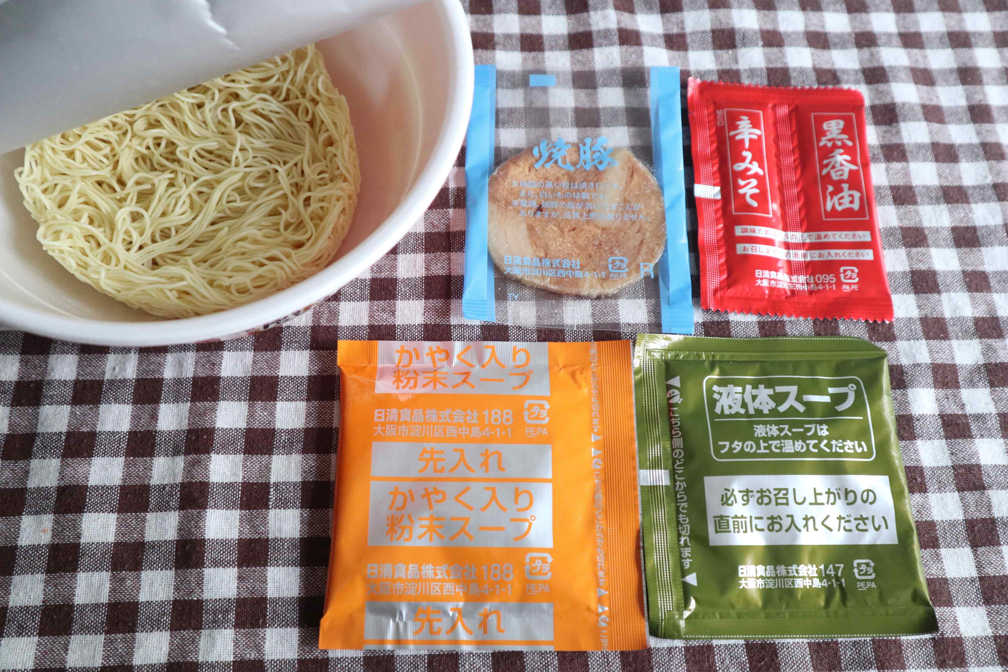 内容は、ノンフライ麺、焼豚、かやく入り粉末スープ(ねぎ、きくらげ)、液体スープ、辛みそ、黒香油です。