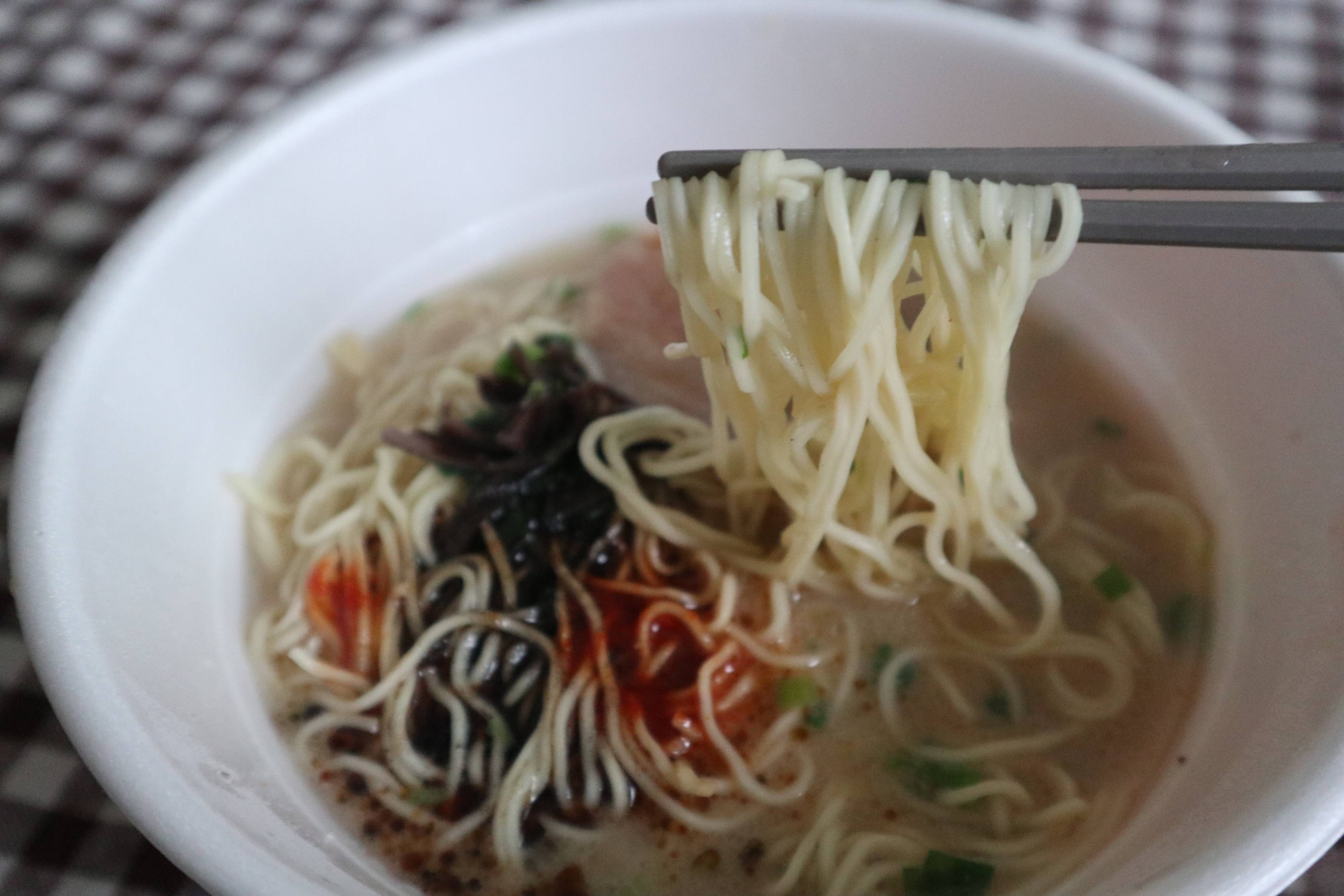 麺は、細麺でコシがあり、まるで生麺のような味わいです。トロッとしたスープがよくからみます。バリカタがお好みのかたは、置き時間を30秒ほど短くするのがおすすめです。好みの固さで食べるとよりおいしいです。