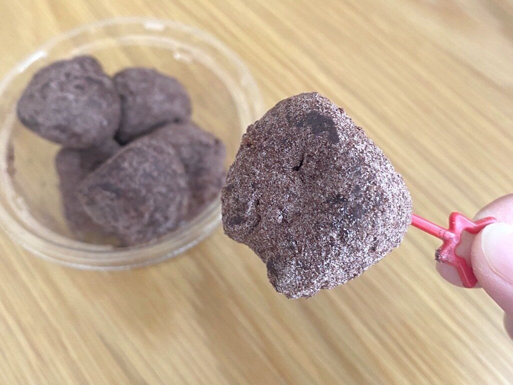 チョコフィリングを練り込んだドーナツ生地に砂糖とココアをまぶしたひとくちサイズのドーナツ。