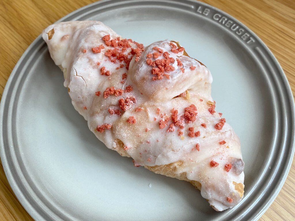 いちごチョコを巻き込んだデニッシュ生地をシュガーグレーズでコーティングし、いちごクランチといちごシュガーをトッピングしたクロワッサンです。
