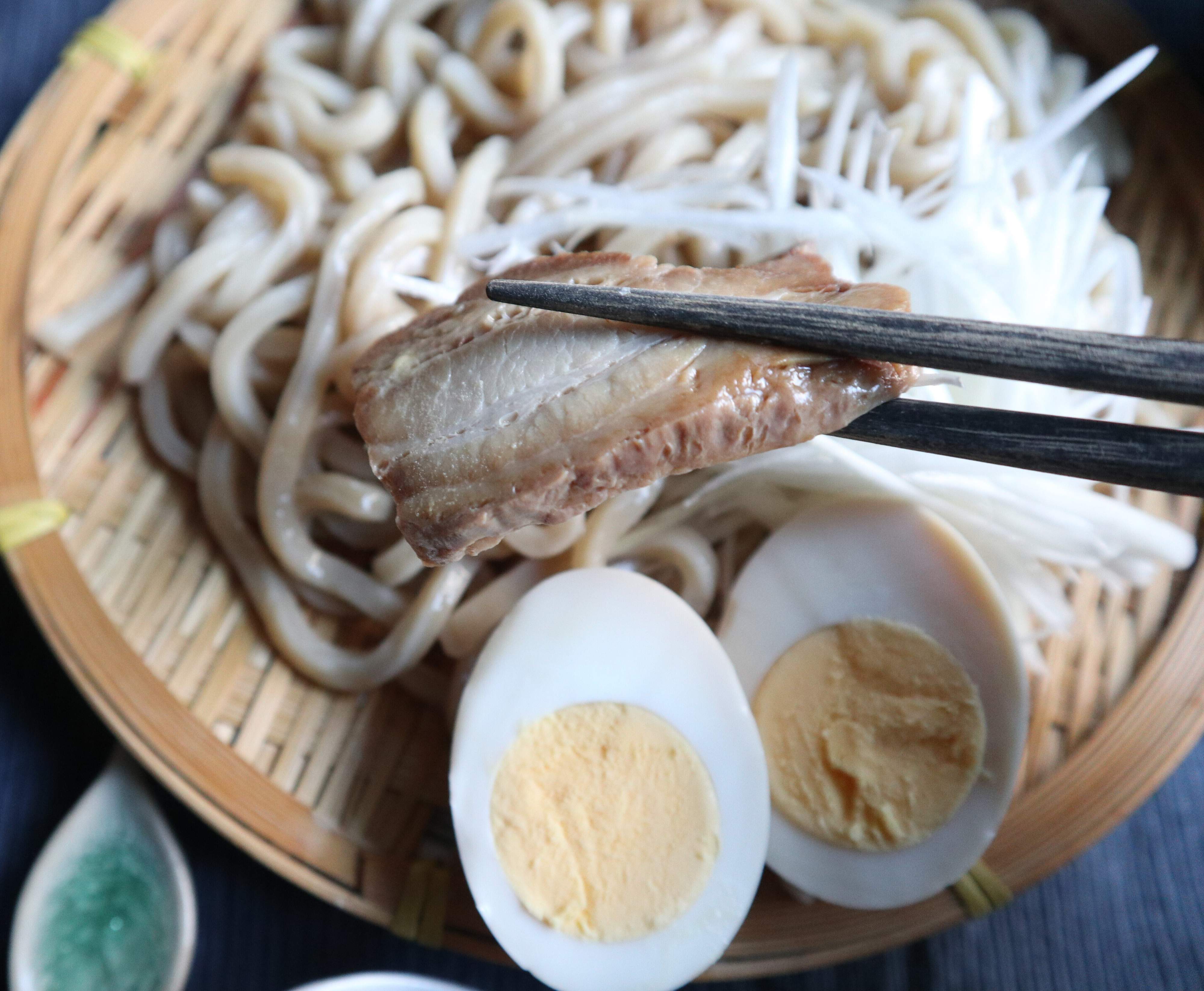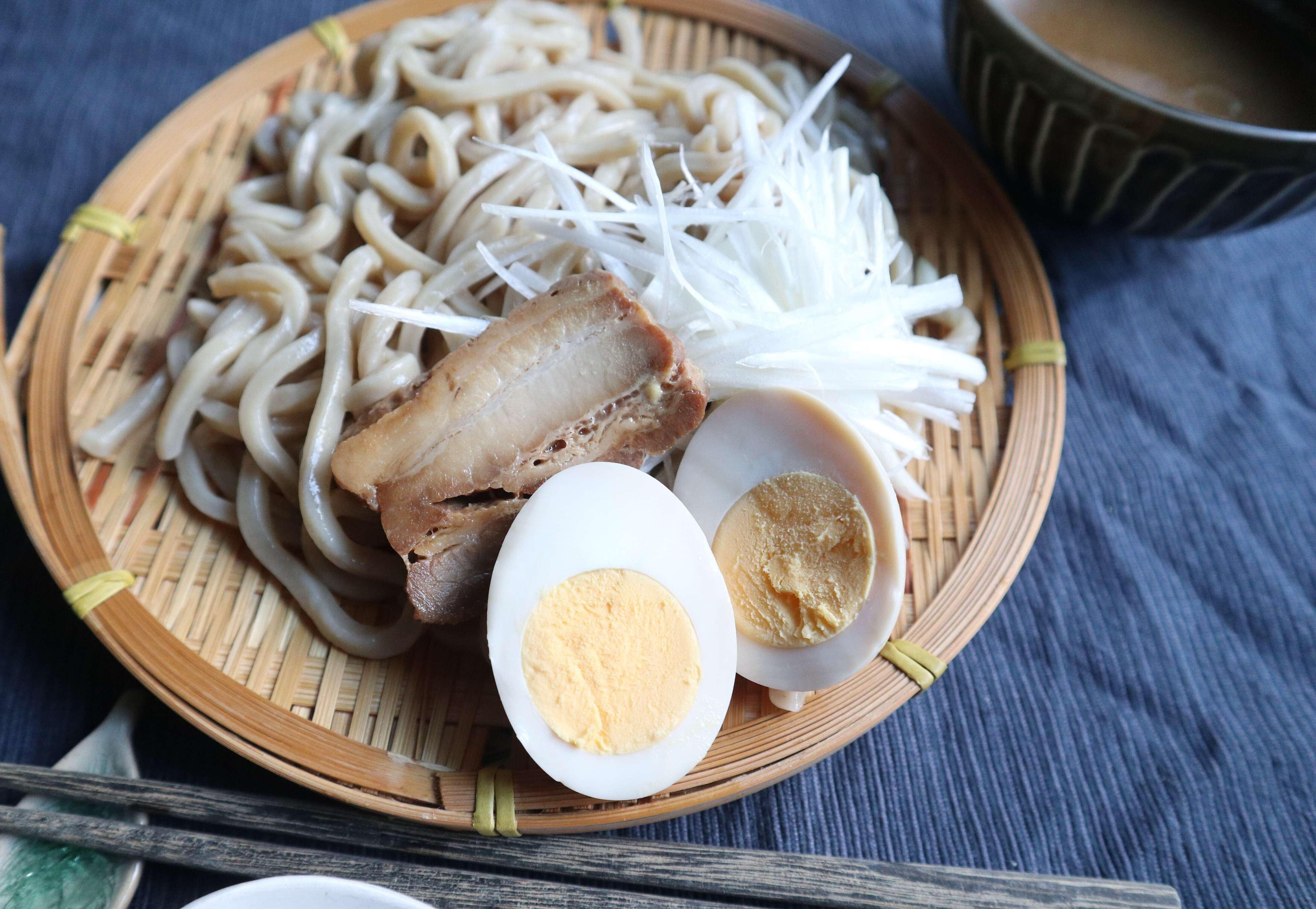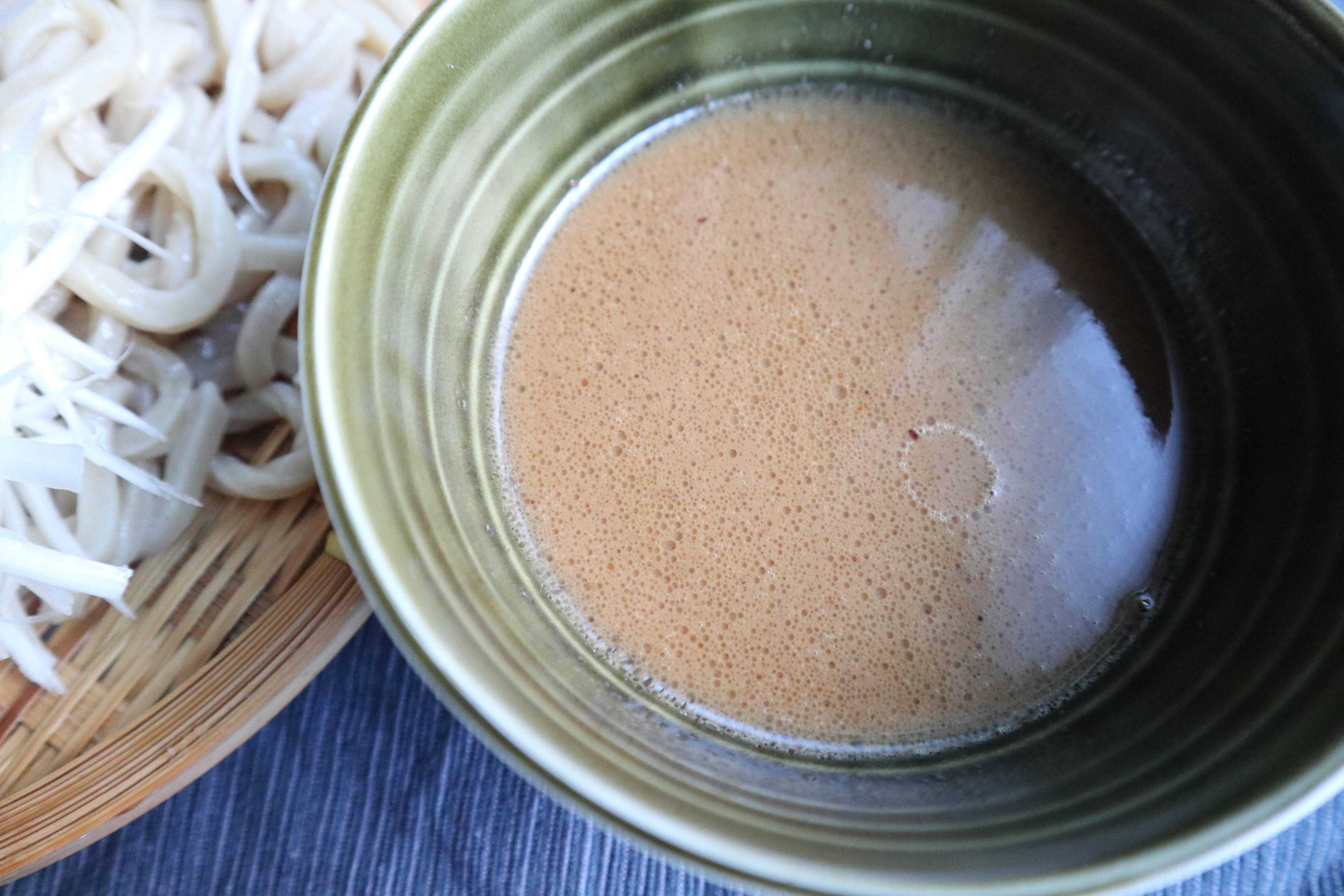 麺とスープそれぞれ器に盛りつけたら、つけ麺の完成です!おすすめトッピングは白髪ねぎと味玉。相性抜群のトッピングですよ。
