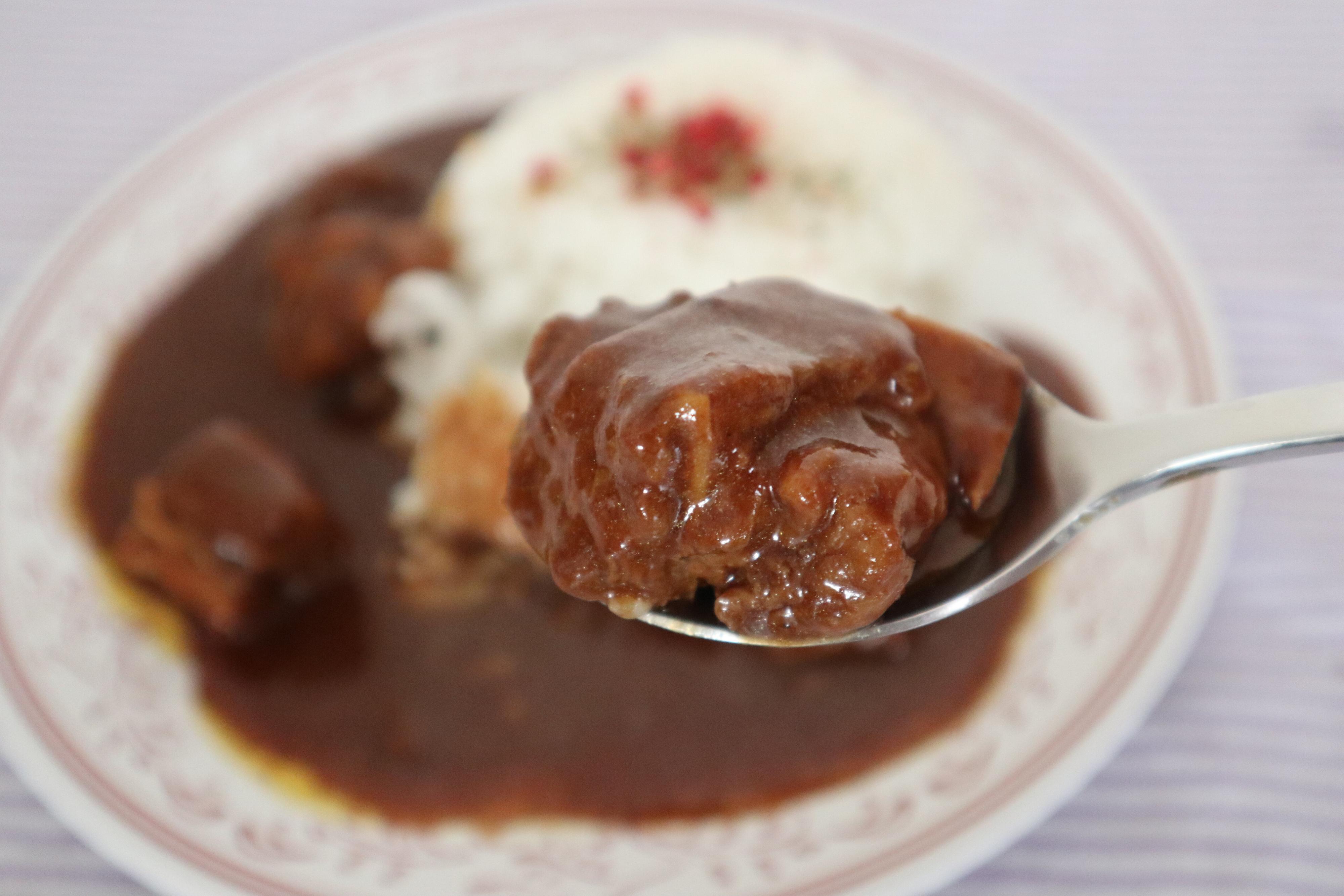 牛肉のかたまりがゴロゴロ入っていてたまりません!柔らかく口に入れるとホロホロと崩れて肉の旨みが口いっぱいに広がります。口福です。さすが金のシリーズ、高級感があります。