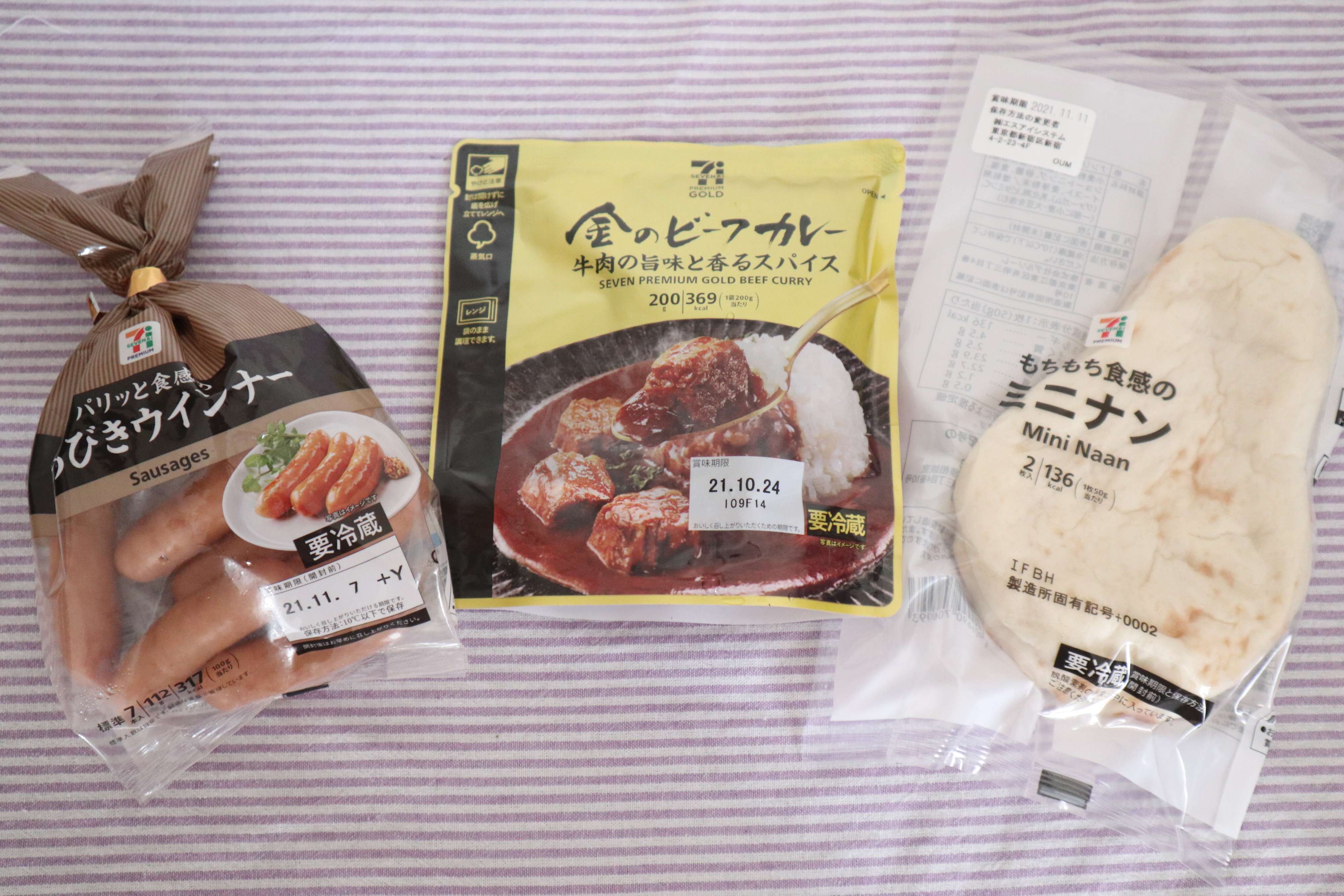 おすすめのアレンジをご紹介します。使う商品は「金のビーフカレー」にクアウェテ、セブンプレミアム「もちもち食感のミニナン」(2枚入り159円)、同じくセブンプレミアムの「パリッと食感あらびきウインナー」(112g/162円)です。