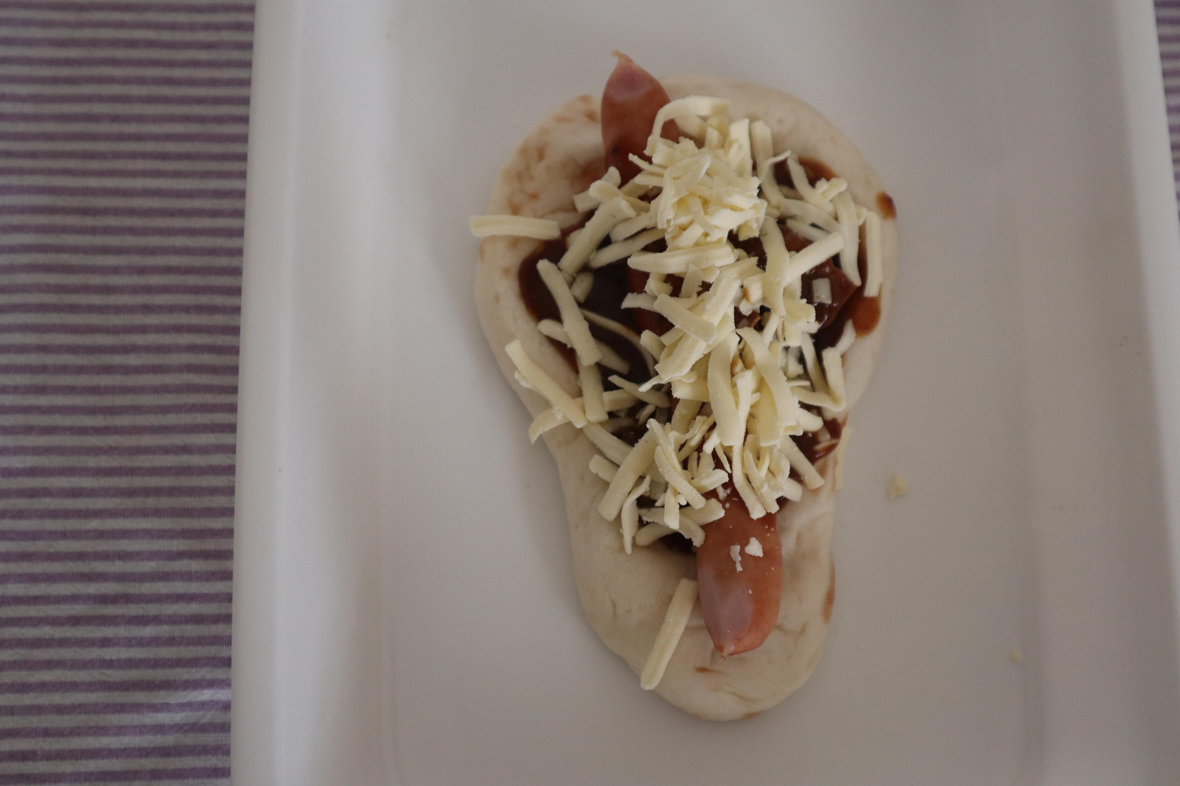 ナンの上に金のカレー、ウィンナー、チーズをトッピングして、オーブントースターでチーズがこんがりするまで焼きます。