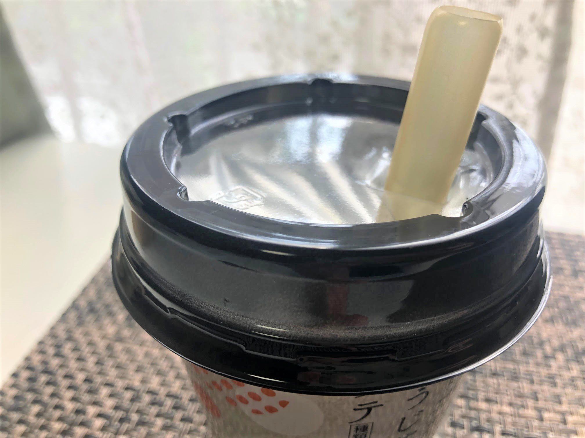 「タピオカほうじ茶ラテ」はふたが二重になっているので、安心してストローを刺すことができます。