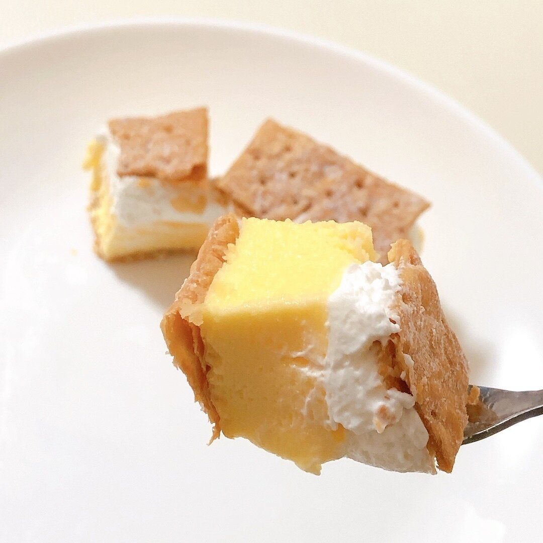 香ばしいパイは薄くて比較的切りやすく、カスタードとホイップを一口で!ふわっと軽い食感のカスタードムースが口の中で甘くとろけ、幸せで満たされます。卵のコクがありながら、メレンゲ入りで軽く、あっさりしています。ホイップは甘さ控えめで、生乳感はカスタードを引き立てます。