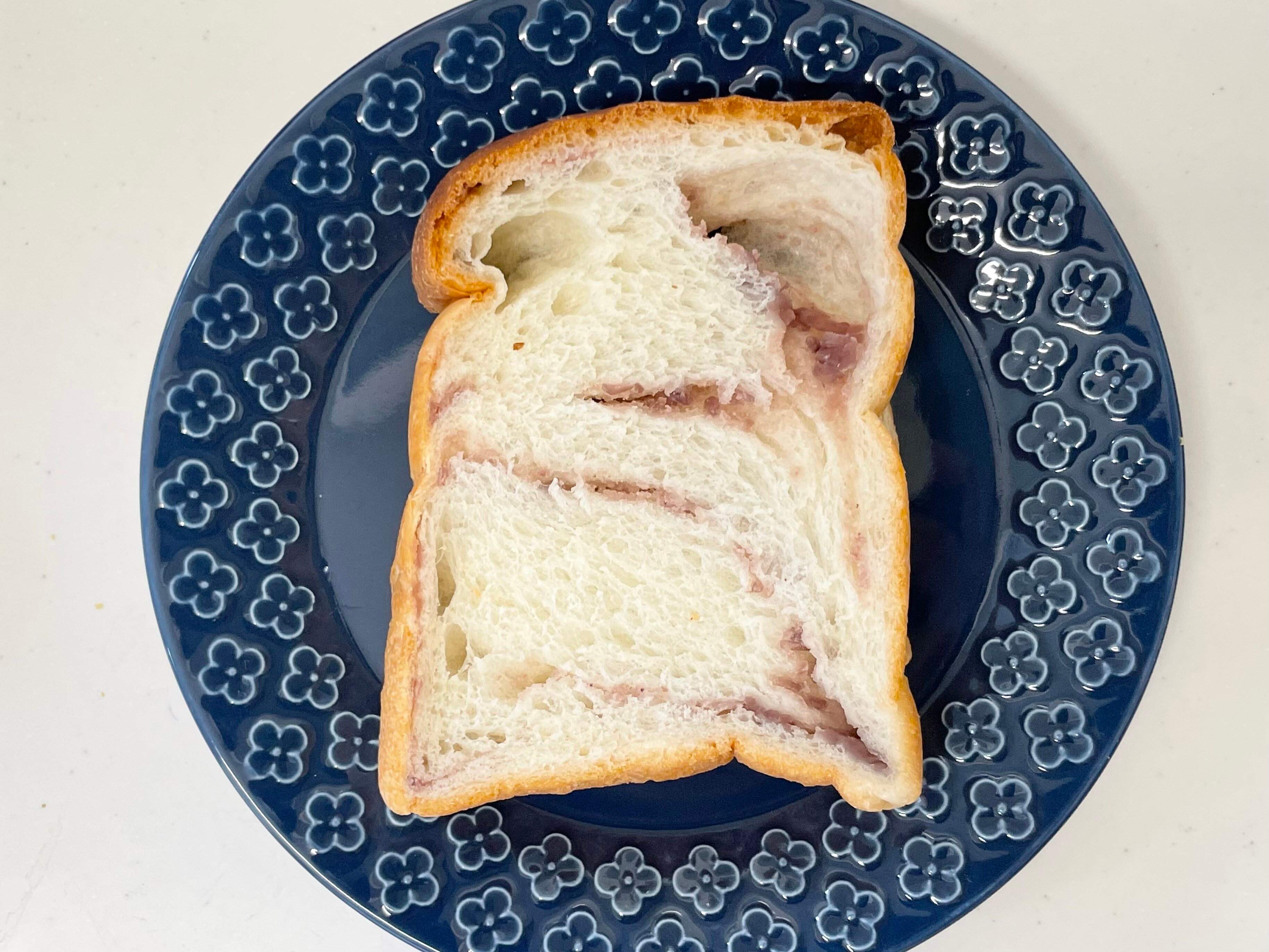 食パンにあんバターが練り込まれていて上品な甘さの粒あんとバターに塩気がプラスされています。ミミまでおいしい!!あまじょっぱいの無限ループで何個でも食べられそうです。