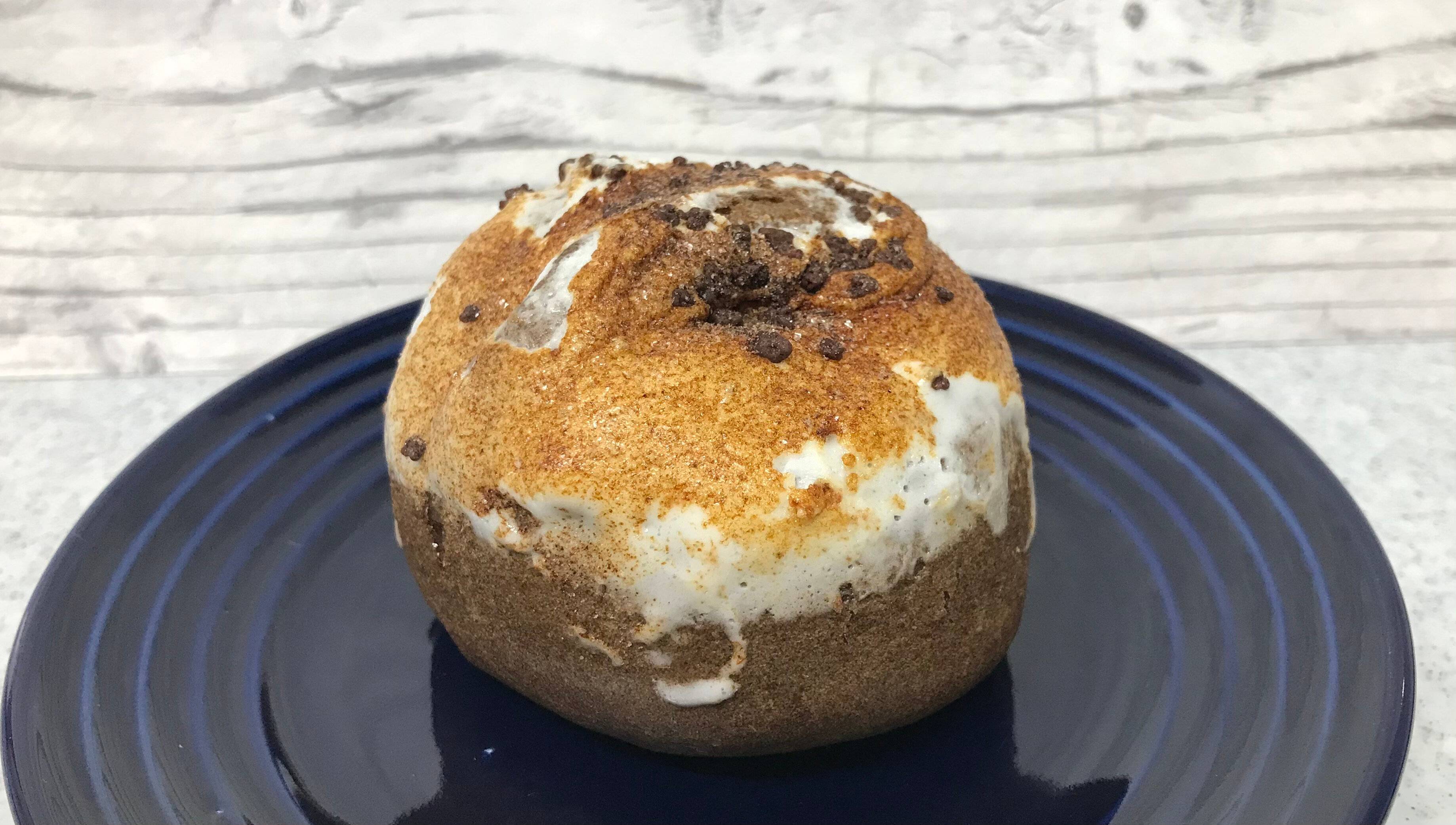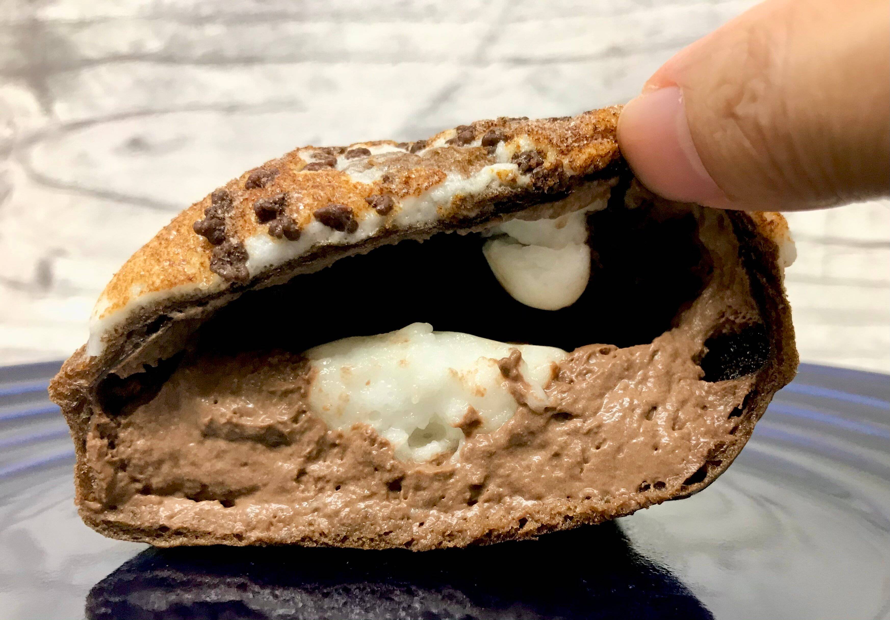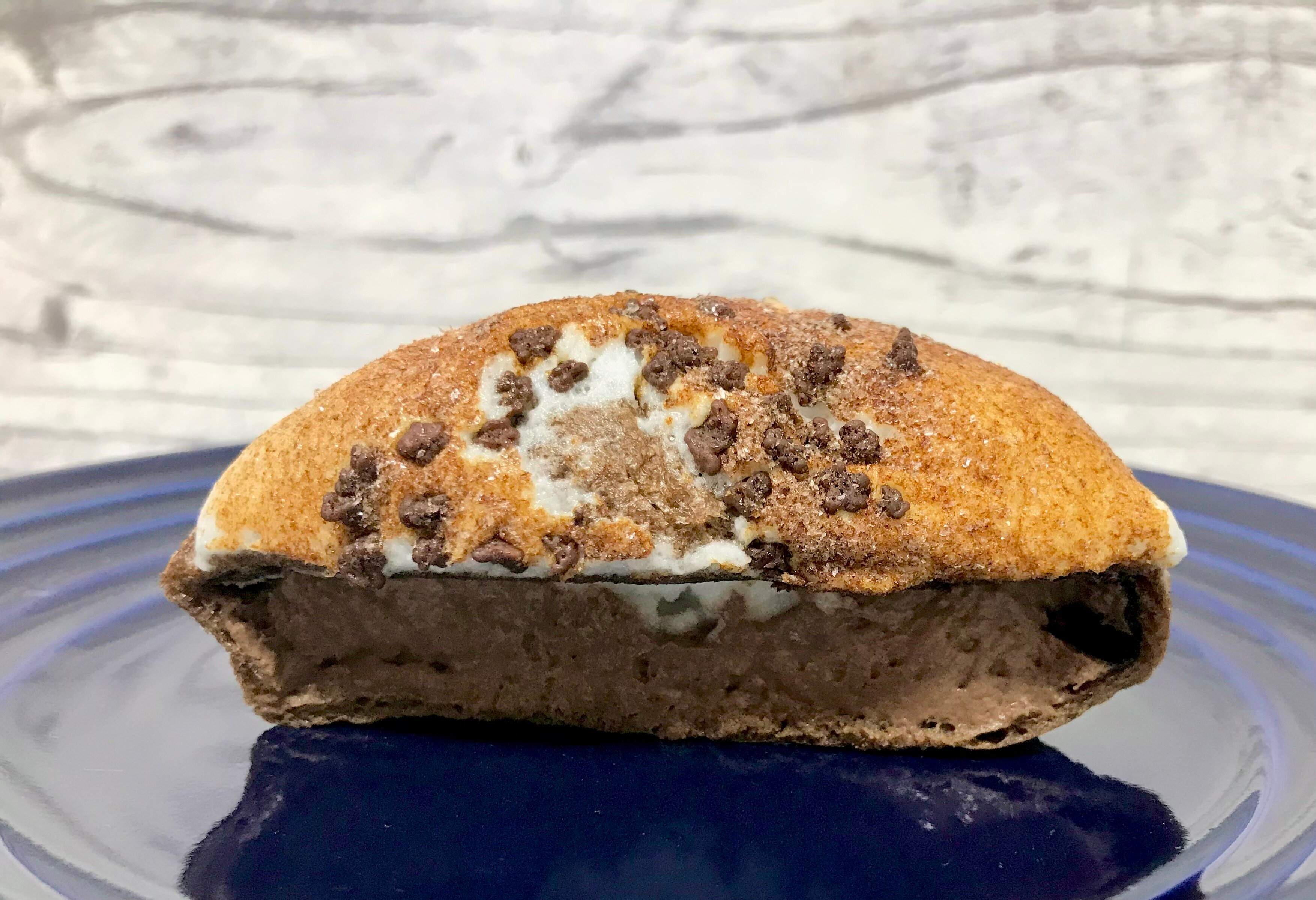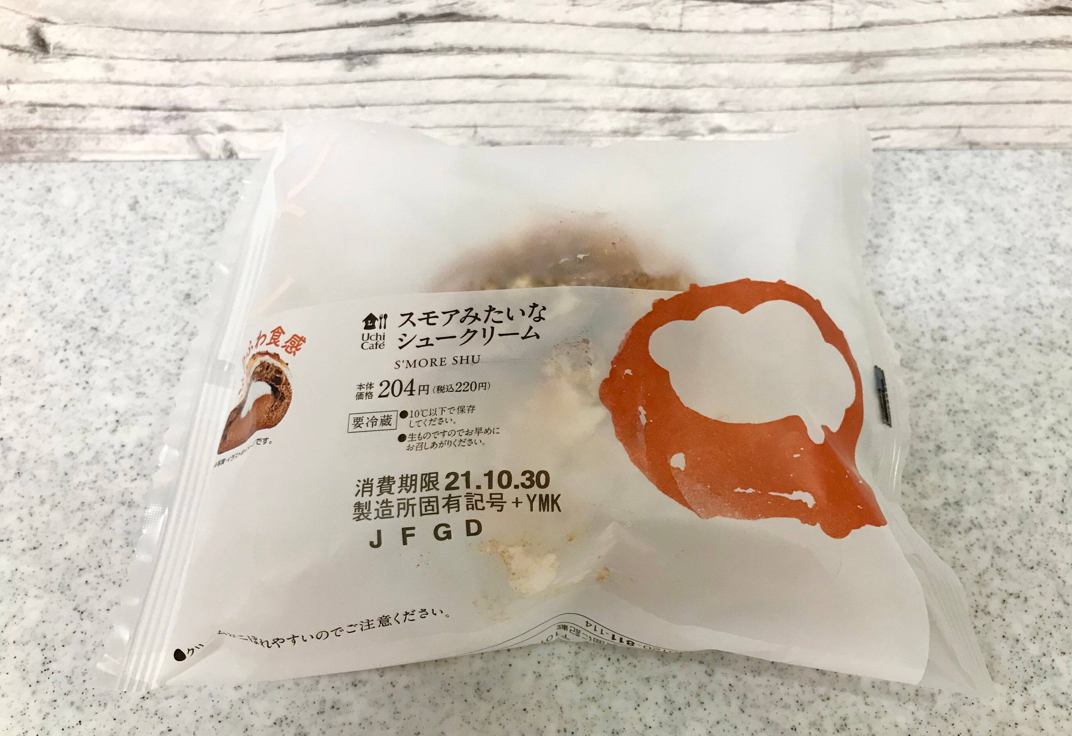 「スモアって、なに?」と思いましたが、中に大好物のチョコレートクリームが入っているシュークリームなので購入してみました。スモアとはアメリカやカナダで人気のデザートで、キャンプファイヤーで焼いたマシュマロとチョコレートをグラハムクラッカーで挟んだものだそうです。