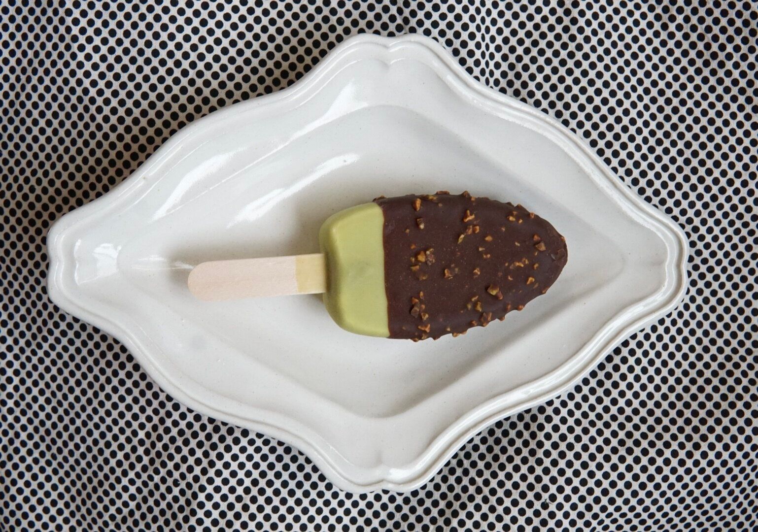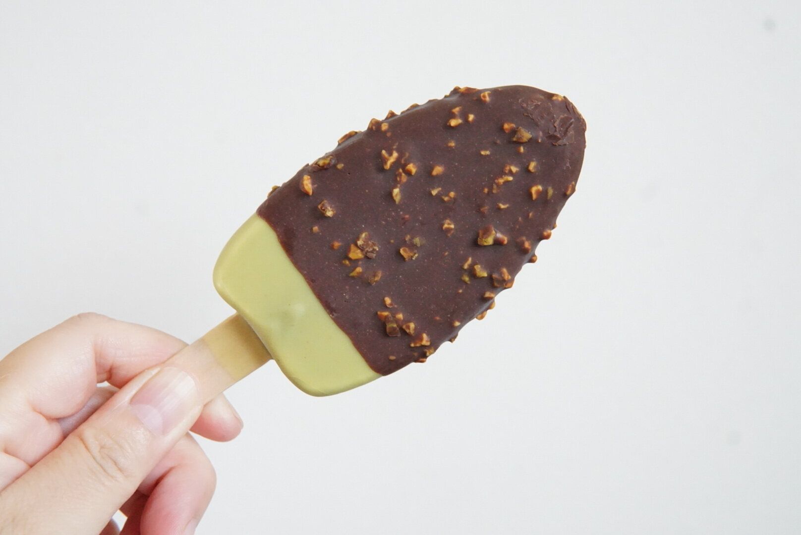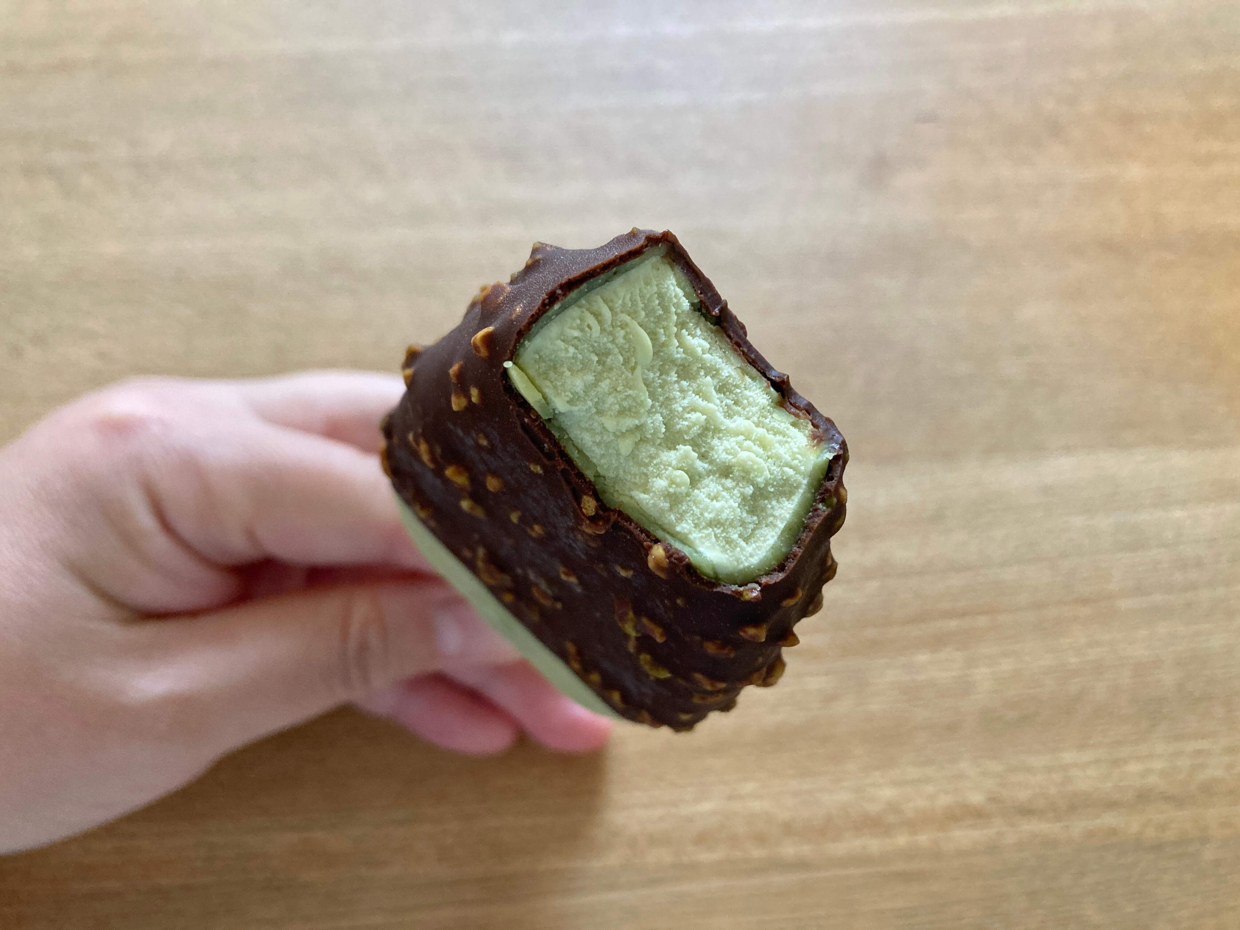 全てにセミスイートチョコがかかっているわけではなく、下部にピスタチオチョコ掛けだけの部分を作ってあるのにこだわりを感じました。見た目でもチョコとピスタチオカラーのコントラストにそそられますし、ピスタチオチョコ掛けだけの部分も楽しめるというのが嬉しいです。