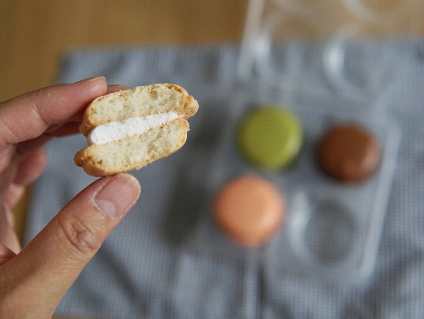 30分解凍したマカロンを食べたところ、いつものマカロンの食感とほぼ同じだと感じました。ただし、クリームのねっとり感が少ないような。