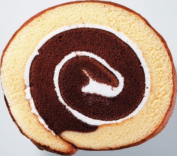 ココア風味のロールケーキを、プレーンスポンジでさらにロール。スポンジどうしのマッチングを楽しみたい。