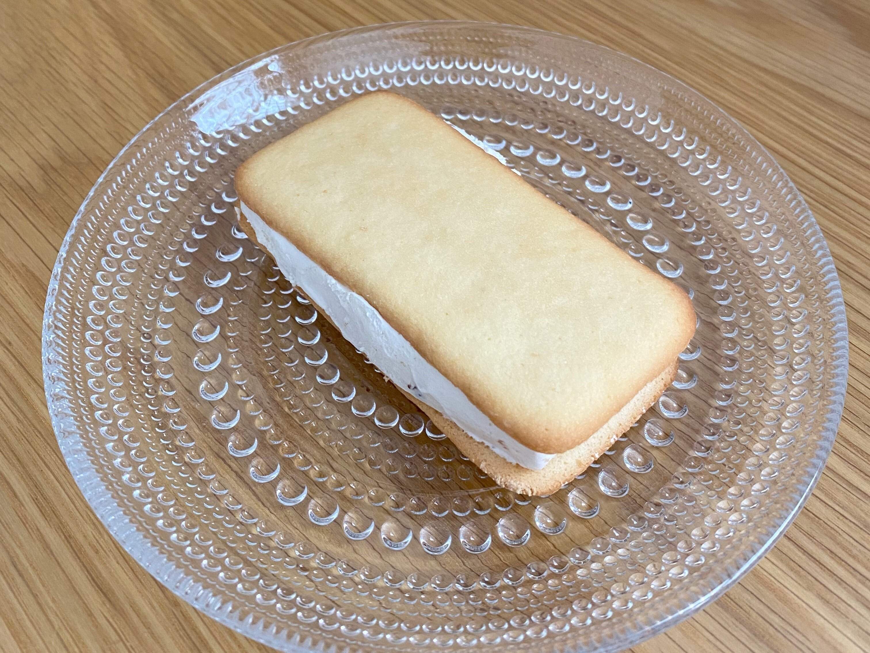 ラムレーズン入りのクリームを、シンプルなビスケット生地でサンドしたアイスです。