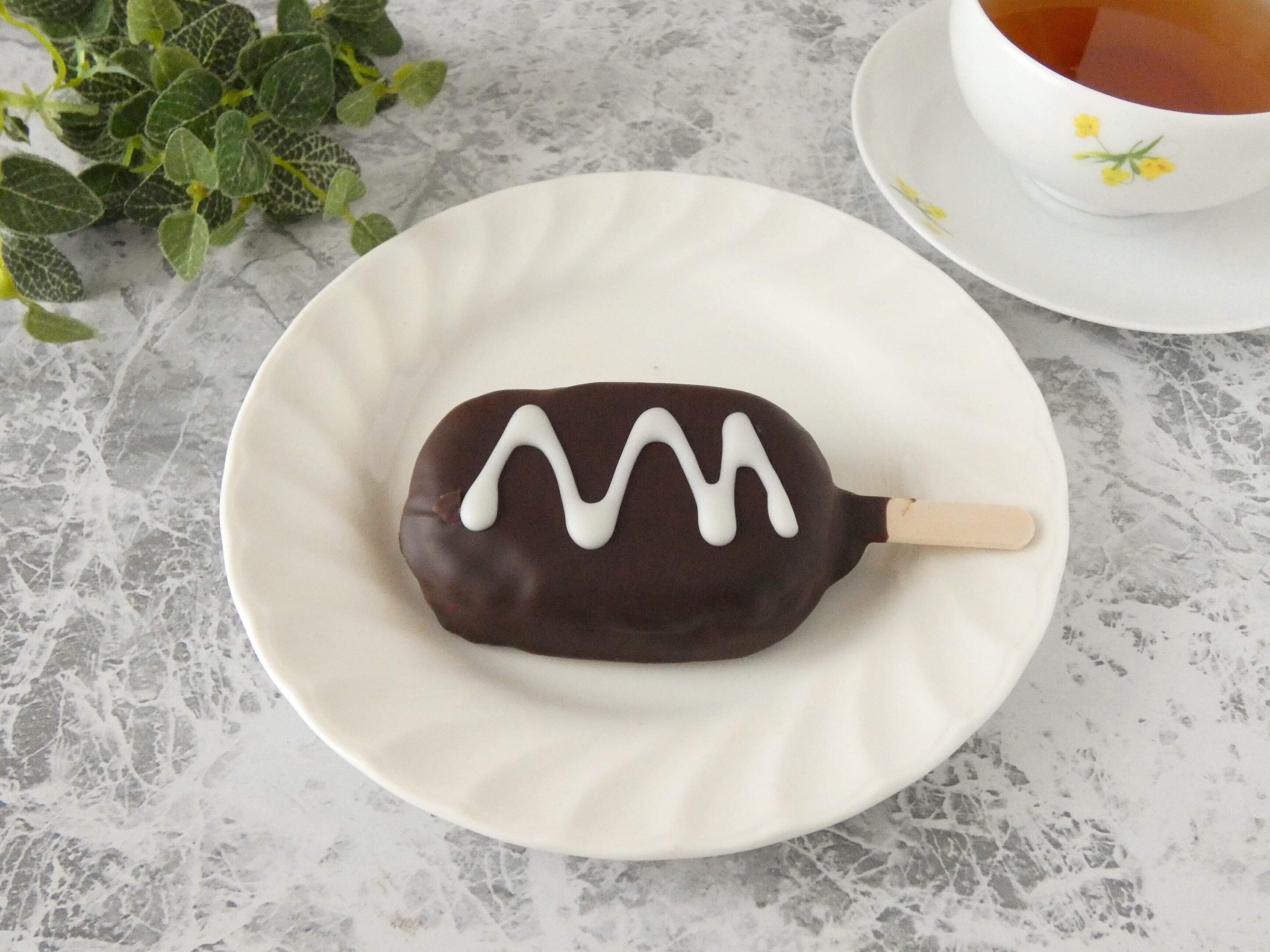 ポップなパッケージで、見た目はチョコレートコーティングしてある棒付きアイス。外はパリッと中は冷たいアイスをイメージしますが、しっとり食感のケーキなんです。