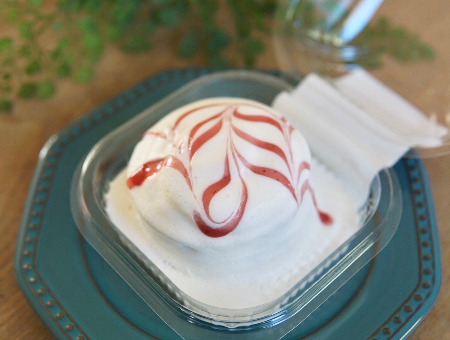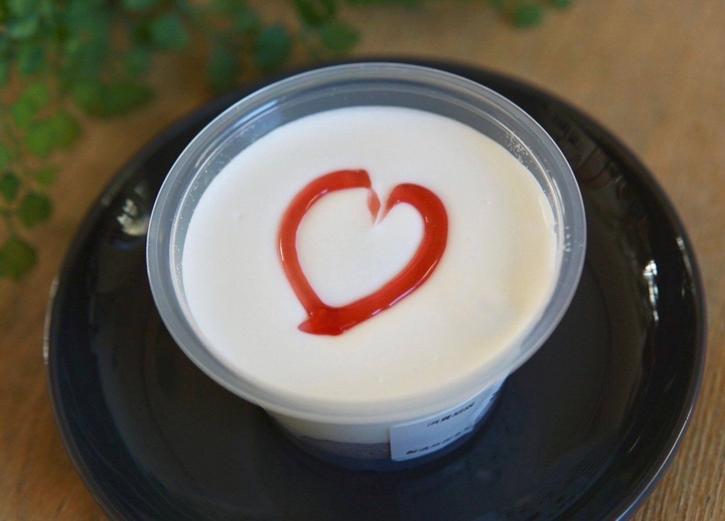 たっぷりクリームにとじこめられたピンク色のわらび餅、どんな味なのか気になります。プルンと大きなわらび餅をクリームと共に一口。噛むと中から甘酸っぱい苺ソースが飛び出します。この甘酸っぱいソースが加わることで、クリームとの相性が高まるなと感じました。ハート型にトッピングされた甘酸っぱい苺ソースが見た目にも可愛らしいです。