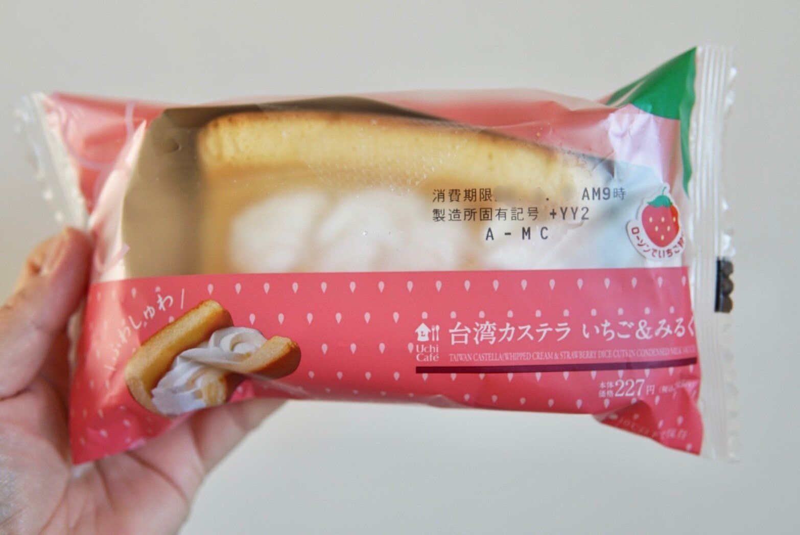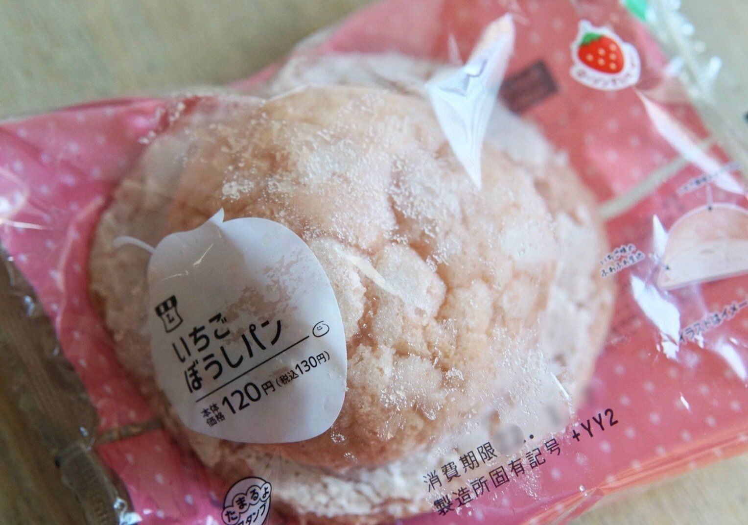 いちご風味のカステラ生地に、中まで淡いピンク色でいちご味のふわふわ生地が包まれています。袋を開けるとフワッと香るいちごフレーバー。ぼうしのふちにあたる部分がカリカリッとして砂糖の甘さが際立ちます。強い個性はないけれど、逆にそれがいいのかもと思わされる素朴な味わいでした。