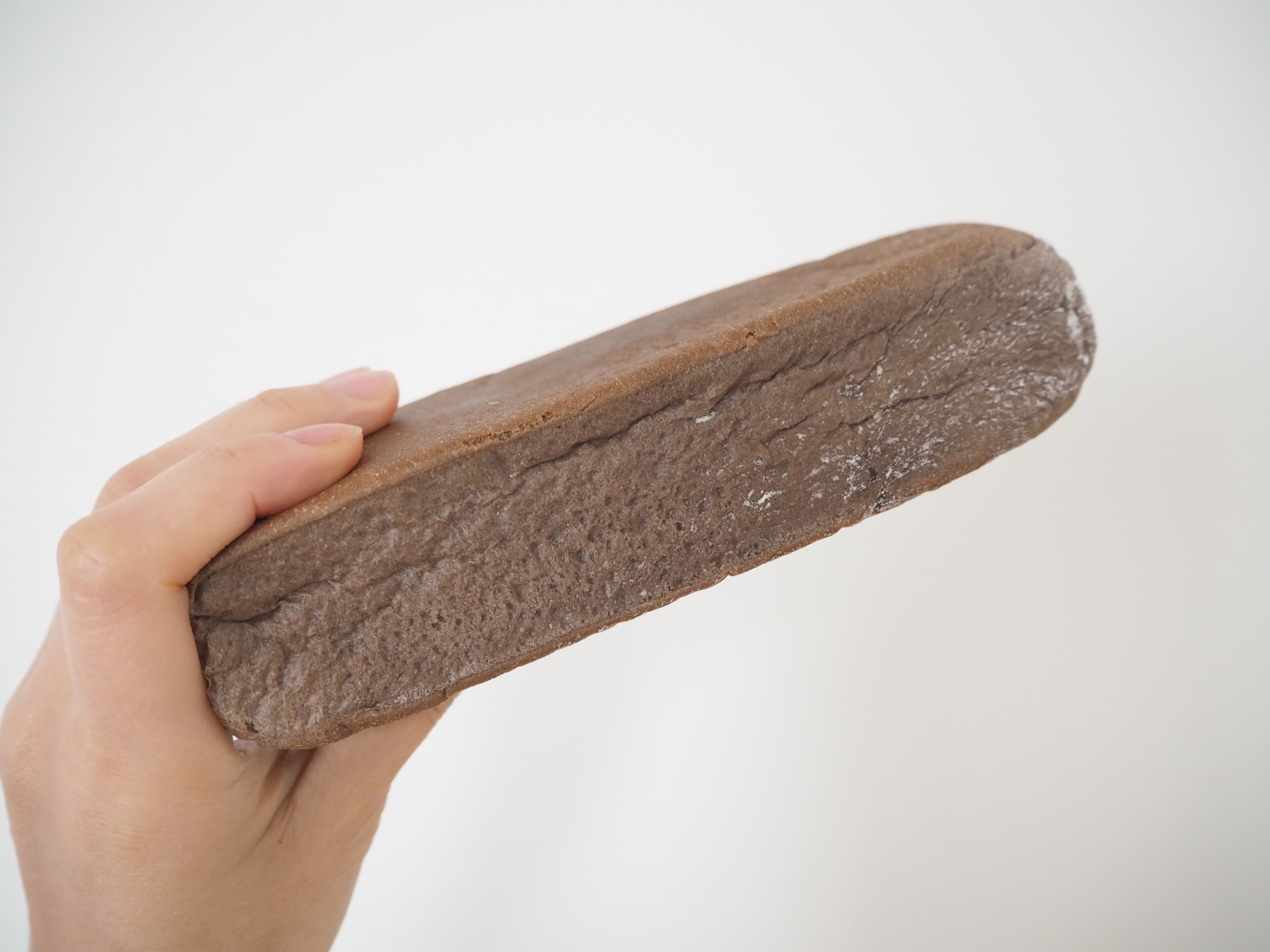 取り出してみると現れるのは、茶色い延べ棒のようなパン。表面は食パンの耳のような焼け具合です。